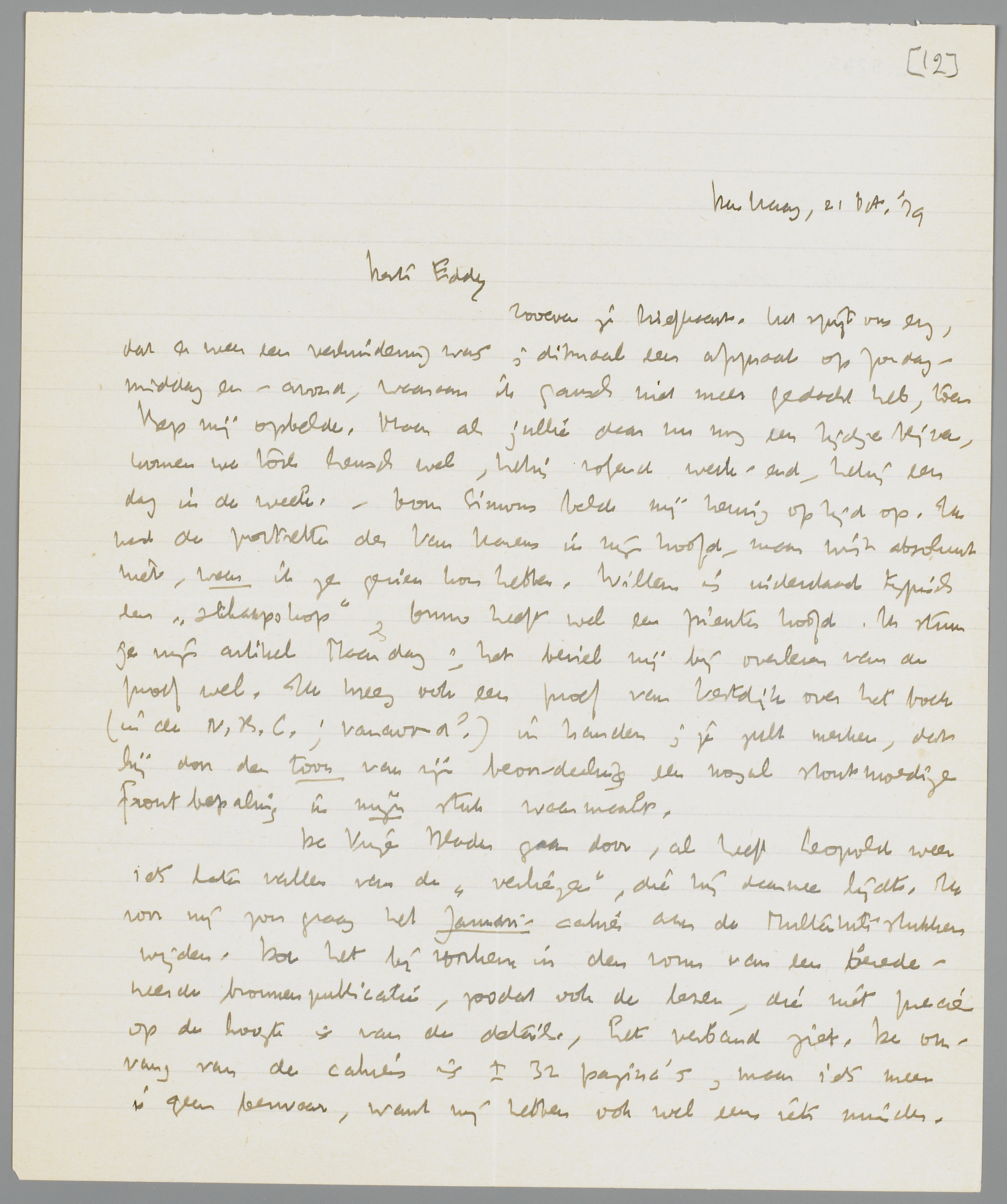 De Vrije Bladen gaan door, al heeft Leopold weer iets laten vallen van de ‘verliezen’, die hij daarmee lijdt. Ik voor mij zou graag het Januari-cahier aan de Multatuli-stukken wijden. Doe het bij voorkeur in den vorm van een beredeneerde bronnenpublicatie, zoodat ook de lezer, die niet precies op de hoogte is van de details, het verband ziet. De omvang van de cahiers is ± 32 pagina's, maar iets meer is geen bezwaar, want wij hebben ook wel eens iets minder. Ik schrijf dit alles op eigen gelegenheid, maar ik ben er wel zeker van, dat Stuiveling en De Gruyter graag dit cahier zullen willen hebben.