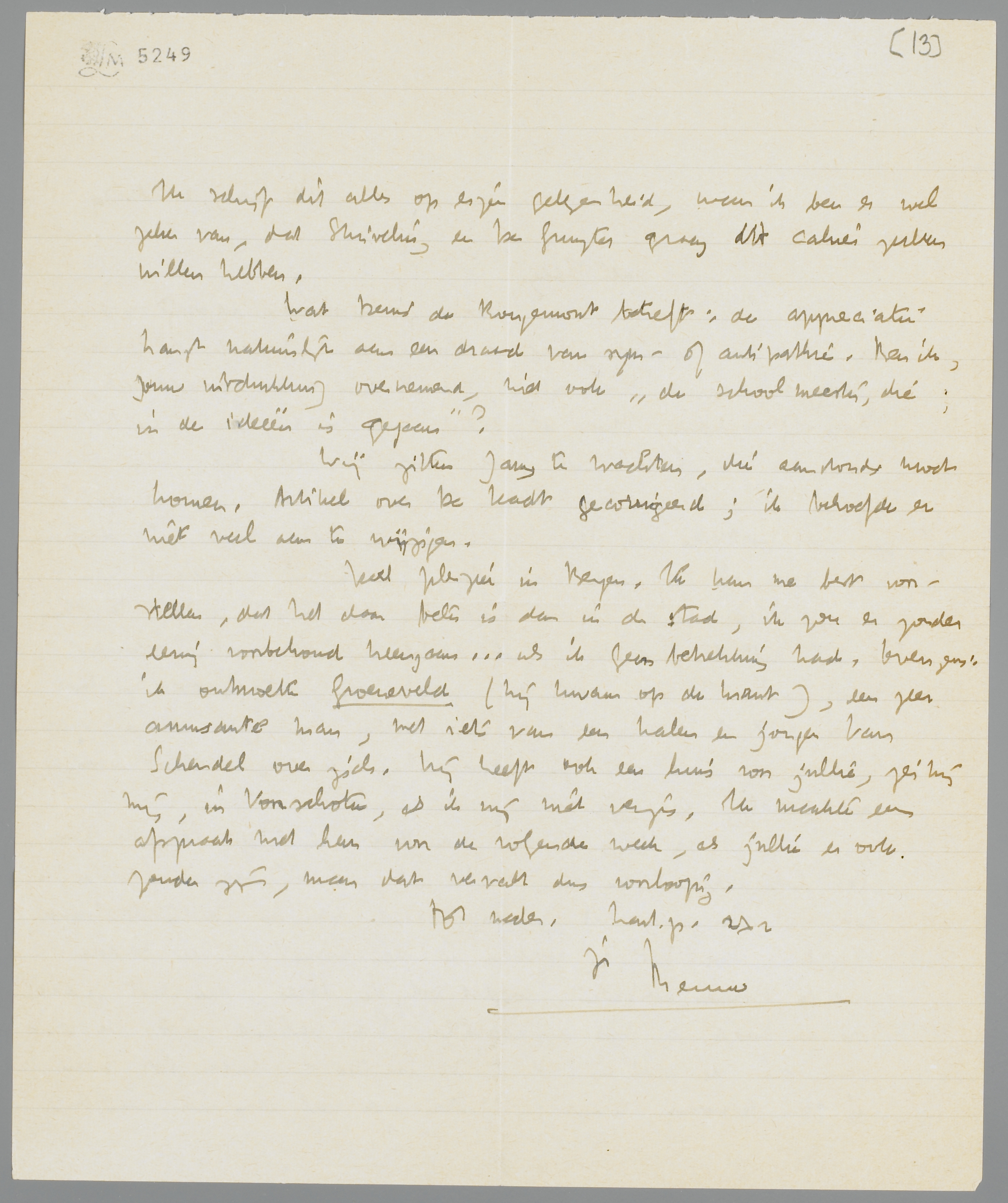 Veel pleizier in Bergen. Ik kan me best voorstellen, dat het daar beter is dan in de stad, ik zou er zonder eenig voorbehoud heengaan... als ik geen betrekking had. Overigens: ik ontmoette Groeneveld (hij kwam op de krant), een zeer amusante man, met iets van een kalen en jongen Van Schendel over zich. Hij heeft ook een huis voor jullie, zei hij mij, in Voorschoten, als ik mij niet vergis. Ik maakte een afspraak met hem voor de volgende week, als jullie er ook zouden zijn, maar dat vervalt dus voorloopig.