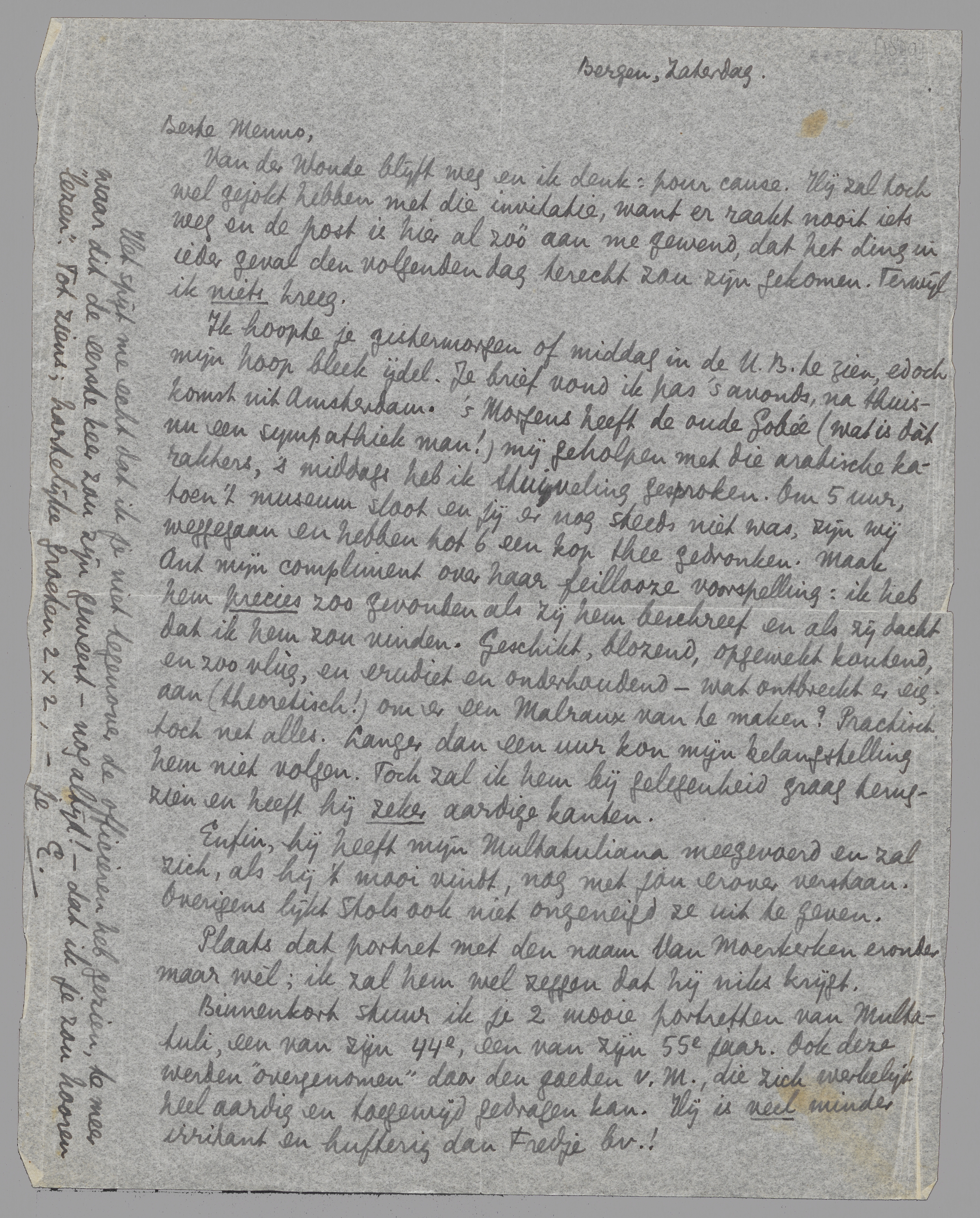 Binnenkort stuur ik je 2 mooie portretten van Multatuli, een van zijn 44e, een van zijn 55e jaar. Ook deze werden ‘overgenomen’ door den goeden v.M., die zich werkelijk heel aardig en toegewijd gedragen kan. Hij is veel minder irritant en hufterig dan Fredje bv.!