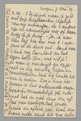 't Is idioot, maar je zult wel drie briefkaarten tegelijk van me ontvangen; de 2 andere zijn nl. nauwelijks weg of daar krijg ik je brief. - Ja, ik was dien dag hier kw. over 8 's morgens al de deur uit. Dank voor 't stuk over Coornhert en dat tegen bolle Ton; wat wil je? de man is overtuigd èn opgevoed in die wereld; liegen en comediespelen doet hij zonder het meer te weten. Zoo'n truc toepassen is dus onbewuste smeerlapperij, vermoedelijk zóó onbewust dat er niet eens een aflaat voor noodig is. Ook zonder biecht en aflaat, zóó, toch een brave, nette vent die qua talis goed is, terwijl jij slecht bent. Straks krijg ik hier de kath. Dubois, meer van 't Bruning-soort, dat je mij óók gestolen kunt krijgen. Je stuk over De Kadt is inderdaad best geschreven; wat ik er tegen heb (niet erg, heel oppervlakkig maar, want misschien is 't tegenover hemzelf zoo juist wel goed) schreef ik je al. Tot zoover op deze ‘codicil’, of is 't onzijdig?
