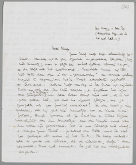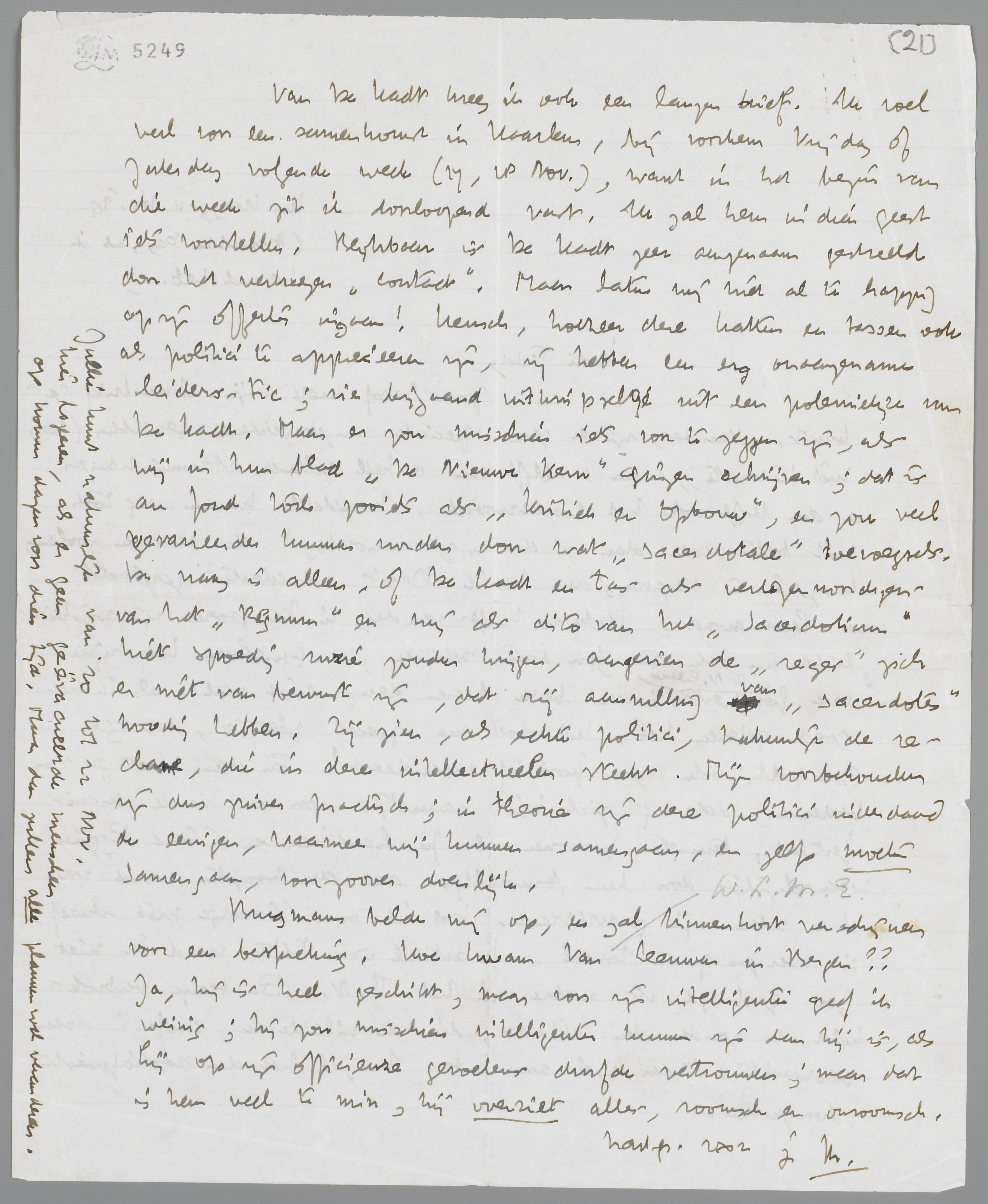 Van De Kadt kreeg ik ook een langen brief. Ik voel veel voor een samenkomst in Haarlem, bij voorkeur Vrijdag of Zaterdag volgende week (17, 18 Nov.), want in het begin van die week zit ik doorloopend vast. Ik zal hem in dien geest iets voorstellen. Blijkbaar is De Kadt zeer aangenaam gestreeld door het verkregen ‘contact’. Maar laten wij niet al te happig op zijn offertes ingaan! Heusch, hoezeer deze katten en tassen ook als politici te apprecieeren zijn, zij hebben een erg onaangename leiderstic; zie bijgaand uitknipseltje uit een polemiekje van De Kadt. Maar er zou misschien iets voor te zeggen zijn, als wij in hun blad De Nieuwe Kern gingen schrijven; dat is au fond toch zooiets als Kritiek en Opbouw, en zou veel gevarieerder kunnen worden door wat ‘sacerdotale’ toevoegsels. De vraag is alleen, of De Kadt en Tas als vertegenwoordigers van het ‘Regnum’ en wij als dito van het ‘Sacerdotium’ niet spoedig ruzie zouden krijgen, aangezien de ‘reges’ zich er niet van bewust zijn, dat zij aanvulling van ‘sacerdotes’ noodig hebben. Zij zien, als echte politici, natuurlijk de reclame, die in deze intellectueelen steekt. Mijn voorbehouden zijn dus zuiver practisch; in theorie zijn deze politici inderdaad de eenigen, waarmee wij kunnen samengaan, en zelfs moeten samengaan, voorzoover doenlijk.