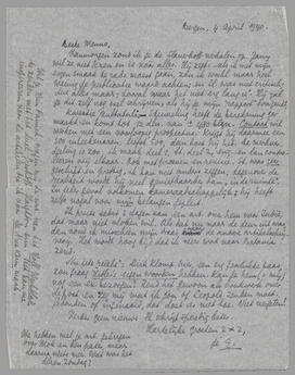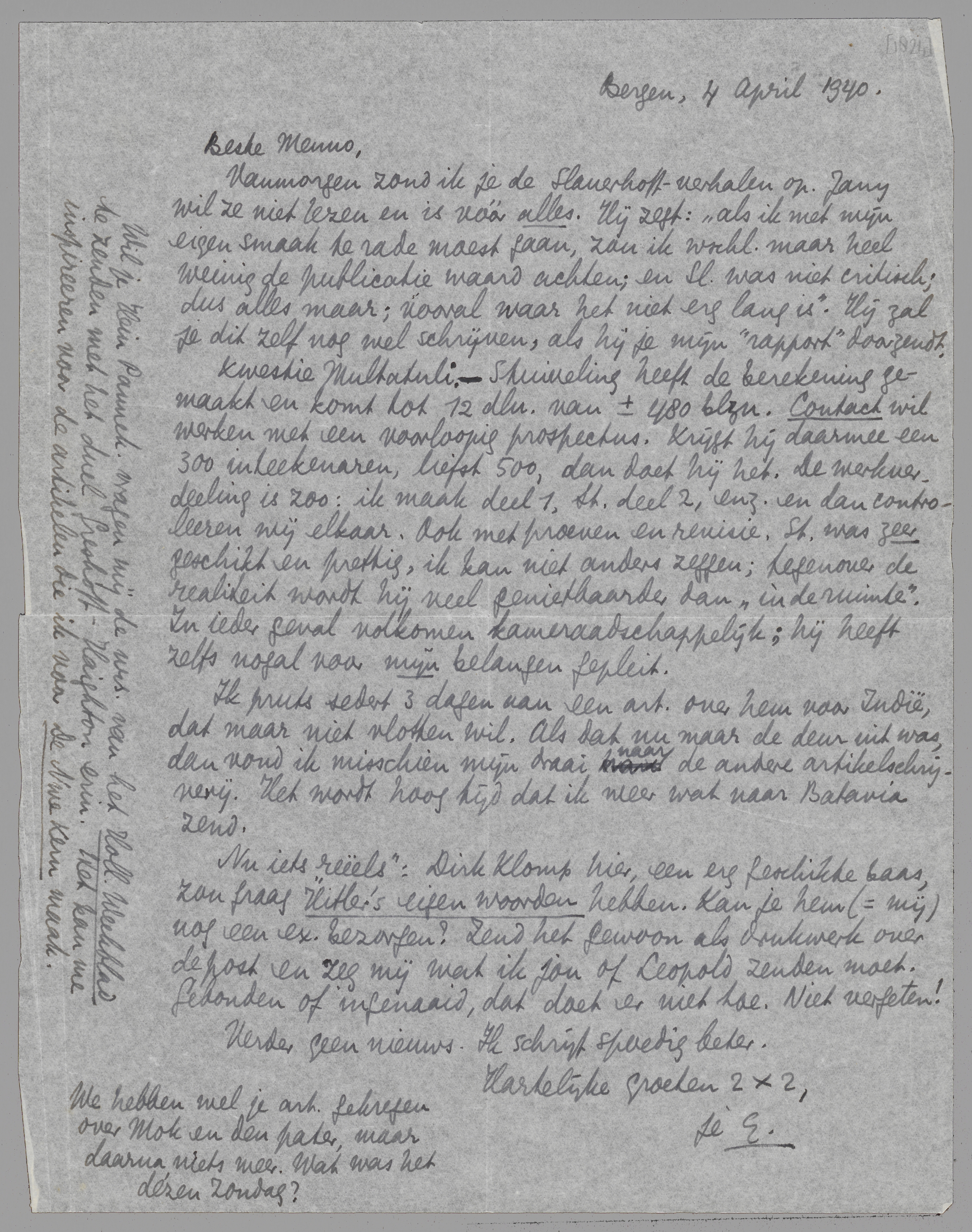 Vanmorgen zond ik je de Slauerhoff-verhalen op. Jany wil ze niet lezen en is vóór alles. Hij zegt: ‘als ik met mijn eigen smaak te rade moest gaan, zou ik wschl. maar heel weinig de publicatie waard achten; en Sl. was niet critisch; dus alles maar; vooral waar het niet erg lang is’. Hij zal je dit zelf nog wel schrijven, als hij je mijn ‘rapport’ doorzendt.