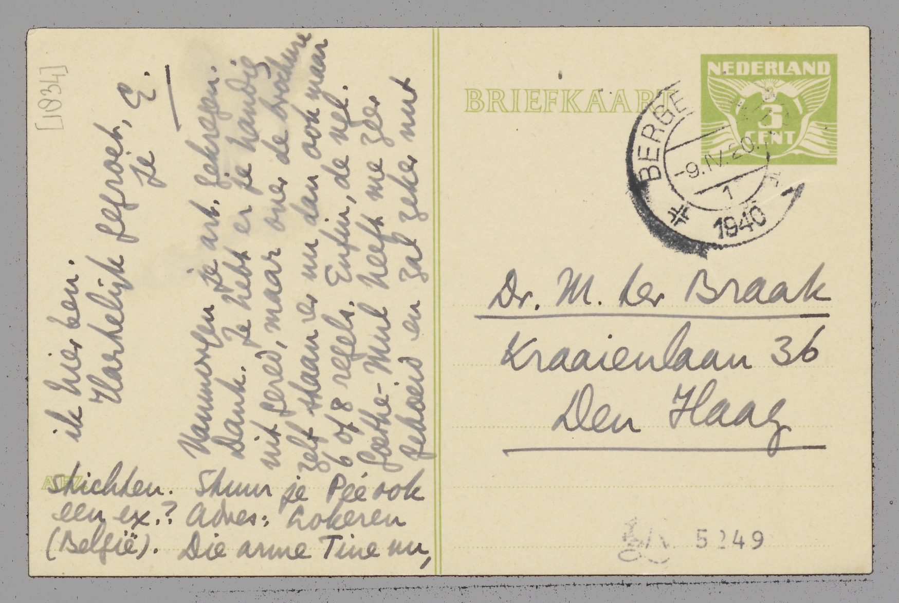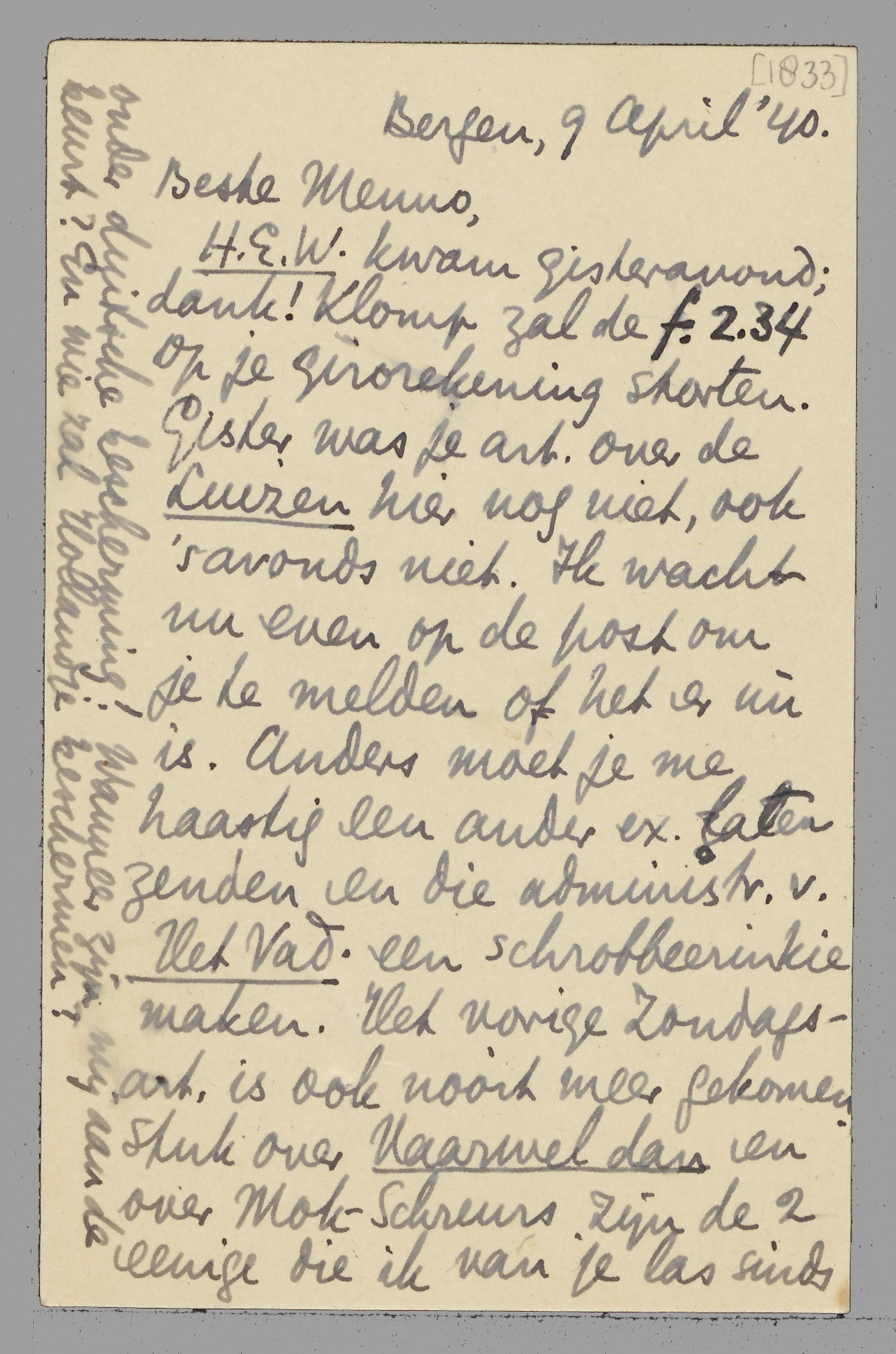 H.E.W. kwam gisteravond; dank! Klomp zal de ƒ 2.34 op je girorekening storten. Gister was je art. over de Luizen hier nog niet, ook 's avonds niet. Ik wacht nu even op de post om je te melden of het er nù is. Anders moet je me haastig een ander ex. laten zenden en die administr. v. Het Vad. een schrobbeerinkie maken. Het vorige Zondags-art. is ook nooit meer gekomen. Stuk over Vaarwel dan en over Mok-Schreurs zijn de 2 eenige die ik van je las sinds ik hier ben.