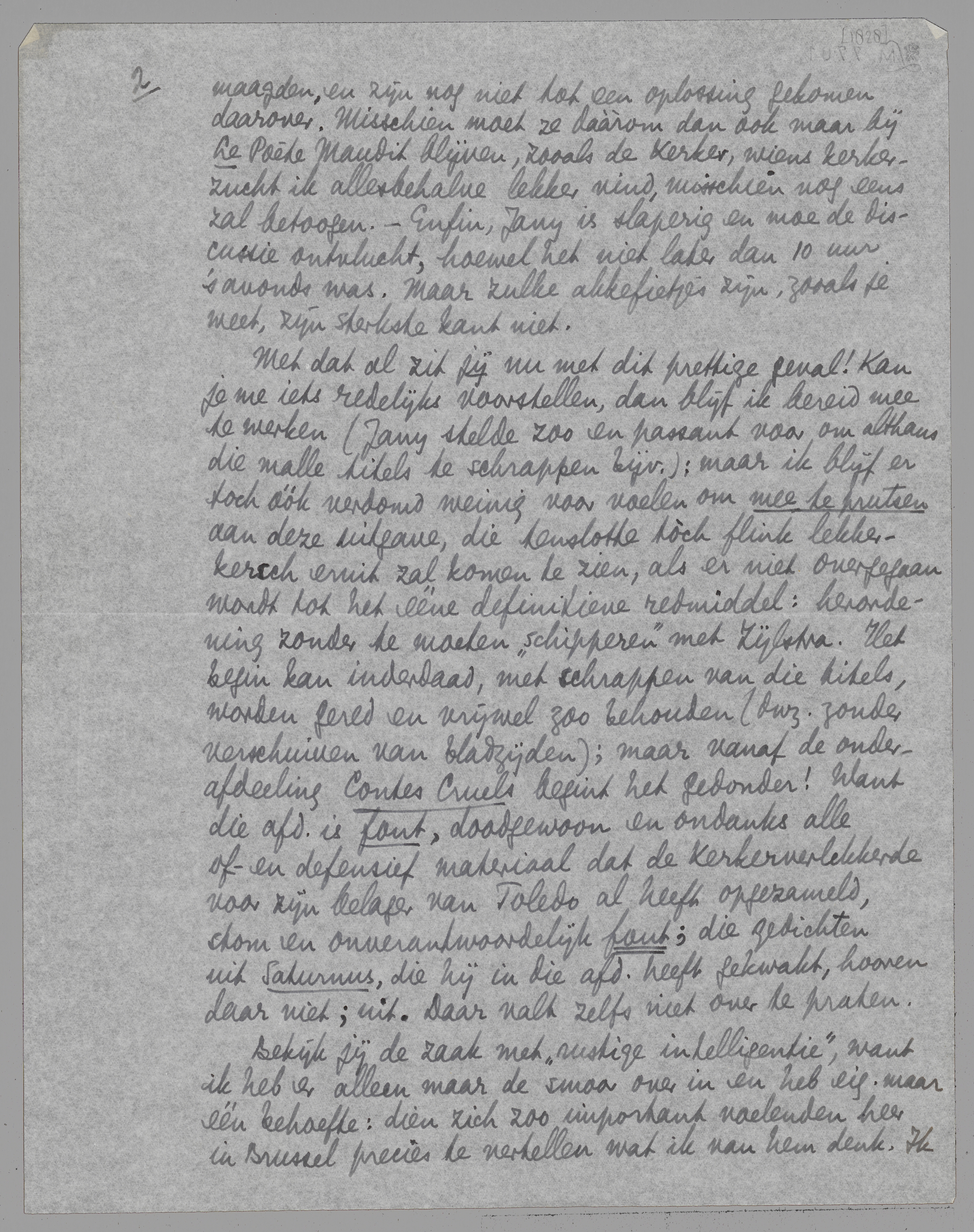 Als je ± weet wat er gedaan moet/kan worden, schrijf mij dan. Ik heb wel de pest in, maar kan er nog iets behoorlijks gedaan worden, dan wil ik best nog meewerken. Maar moet het prutswerk blijven, dan houd ik mij liever vrij t.o.v. de heele editie; zoodat ik dan ook van het schrijven van die inl. voor het proza en überhaupt iedere verdere bemoeienis moet afzien. Vriend of vijand, nl. van deze editie. Je zult de juistheid van dat standpunt inzien. - Als je nu maar begrijpt, dat hier geen haar ‘pestlust’ of zoo van mij in steekt, integendeel. Ik was gisteravond eerst prettig verrast, en toen ik die verzen weer las, heelemaal veroverd. Maar vanaf vanmorgen ging het mis, en steeds meer mis, naarmate ik meer lette op wat Lekkerk., niet als tekstkundige, maar als indeeler, ‘meegewerkt’ had.