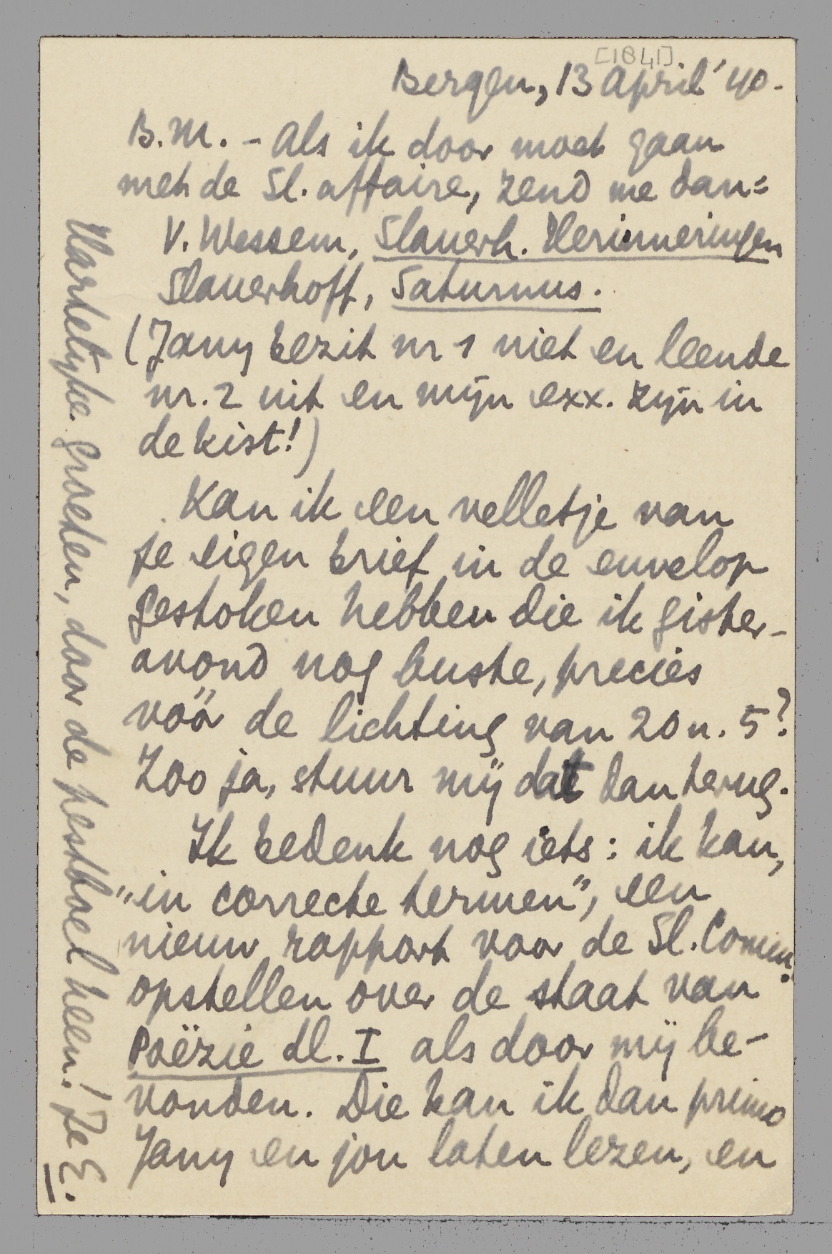 Ik bedenk nog iets: ik kan, ‘in correcte termen’, een nieuw rapport voor de Sl.Comm. opstellen over de staat van Poëzie dl. I als door mij bevonden. Die kan ik dan primo Jany en jou laten lezen, en jij kunt die doorzenden aan de anderen, inbegrepen Lekkerk. Daar ontkom je tóch niet aan, als je zelf niet beslissen kunt. Of een vergadering, of dit, of allebei. Dan weet L. ook wat ik tegen zijn gedoei heb, zonder dat ik hèm schrijf.