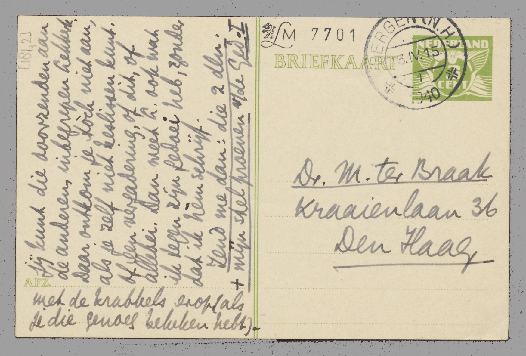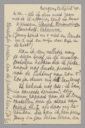 (Jany bezit nr 1 niet en leende nr. 2 uit en mijn exx. zijn in de kist!) Kan ik een velletje van je eigen brief in de envelop gestoken hebben die ik gisteravond nog buste, precies vóór de lichting van 20 u.5? Zoo ja, stuur mij dat dan terug.