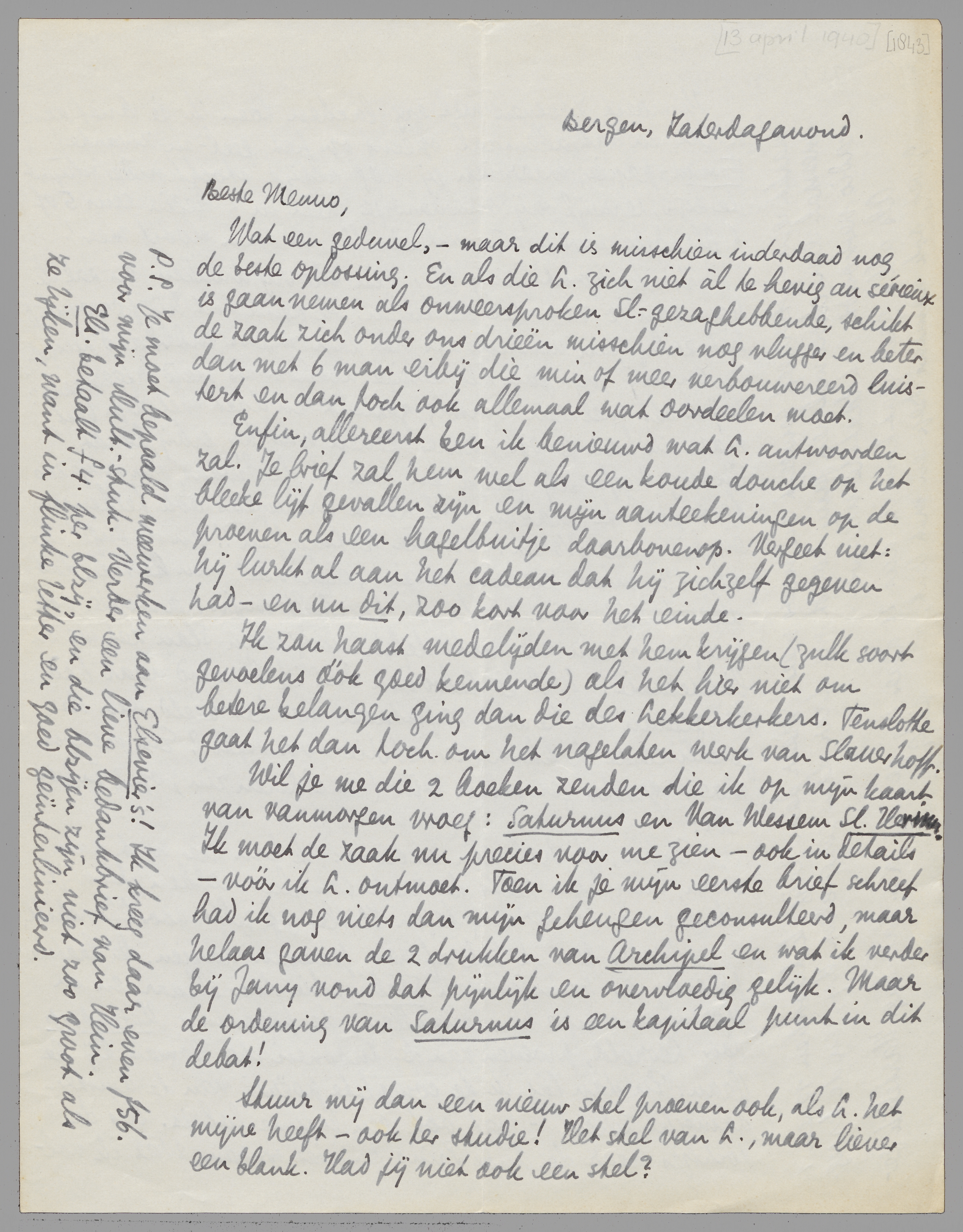 Wil je me die 2 boeken zenden die ik op mijn kaart van vanmorgen vroeg: Saturnus en Van Wessem Sl. Herinn. Ik moet de zaak nu precies voor me zien - ook in details - vóór ik L. ontmoet. Toen ik je mijn eerste brief schreef had ik nog niets dan mijn geheugen geconsulteerd, maar helaas gaven de 2 drukken van Archipel en wat ik verder bij Jany vond dat pijnlijk en overvloedig gelijk. Maar de ordening van Saturnus is een kapitaal punt in dit debat!
