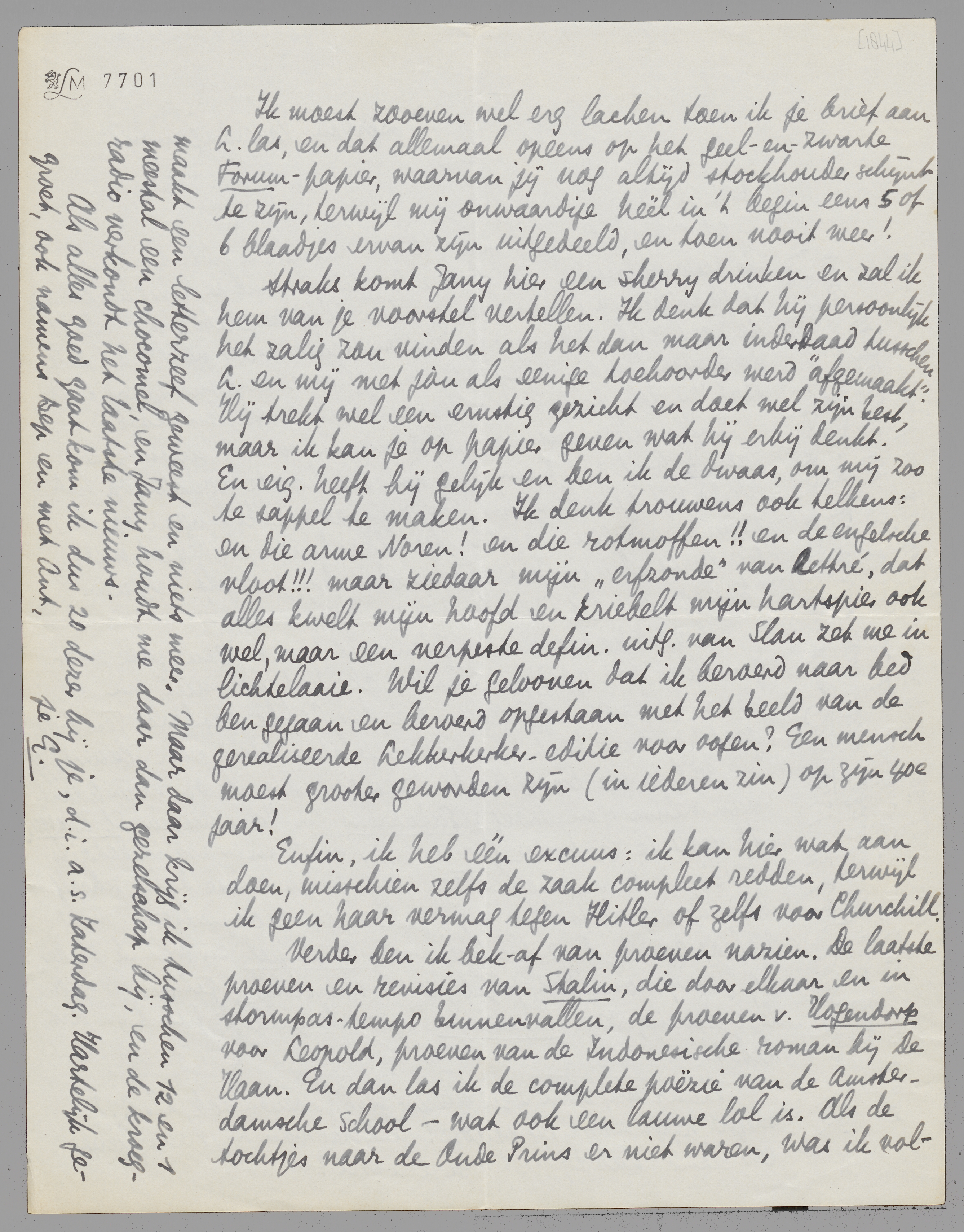 Ik moest zooeven wel erg lachen toen ik je brief aan L. las, en dat allemaal opeens op het geel-en-zwarte Forum-papier, waarvan jij nog altijd stockhouder schijnt te zijn, terwijl mij onwaardige héél in 't begin eens 5 of 6 blaadjes ervan zijn uitgedeeld, en toen nooit weer!