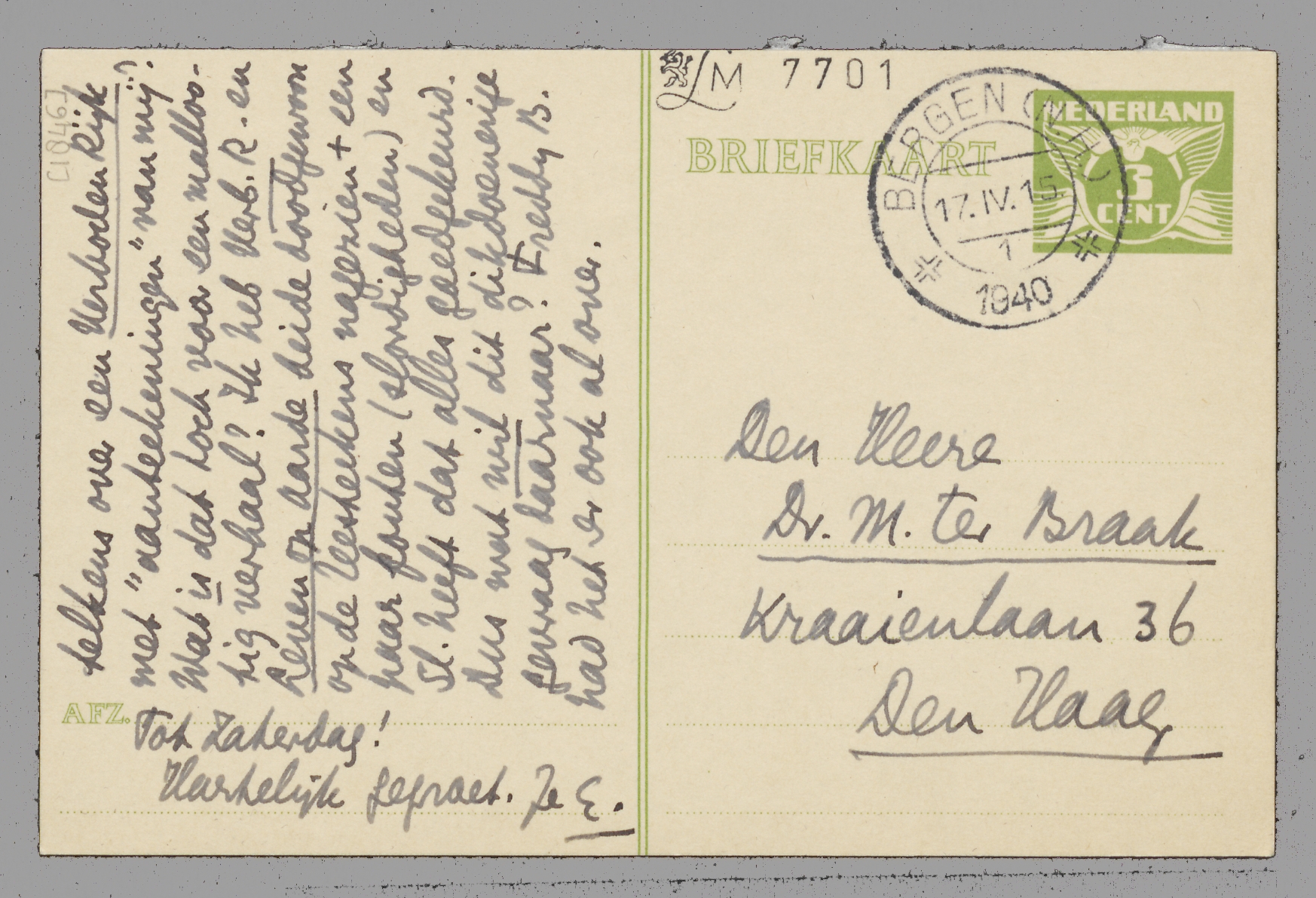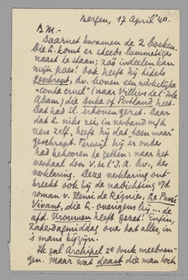 Ik zal Archipel 2e druk meebrengen. Maar wat daast die man toch telkens over een Verboden Rijk met ‘aanteekeningen’ van mij? Wat is dat toch voor een mallootig verhaal? Ik heb Verb. R. en Leven op Aarde beide doodgewoon op de leesteekens nagezien + een paar fouten (slordigheden) en Sl. heeft dat alles goedgekeurd. Dus wat wil dit dikdoenerige gevraag daarnaar? Freddy B. had het er ook al over.
