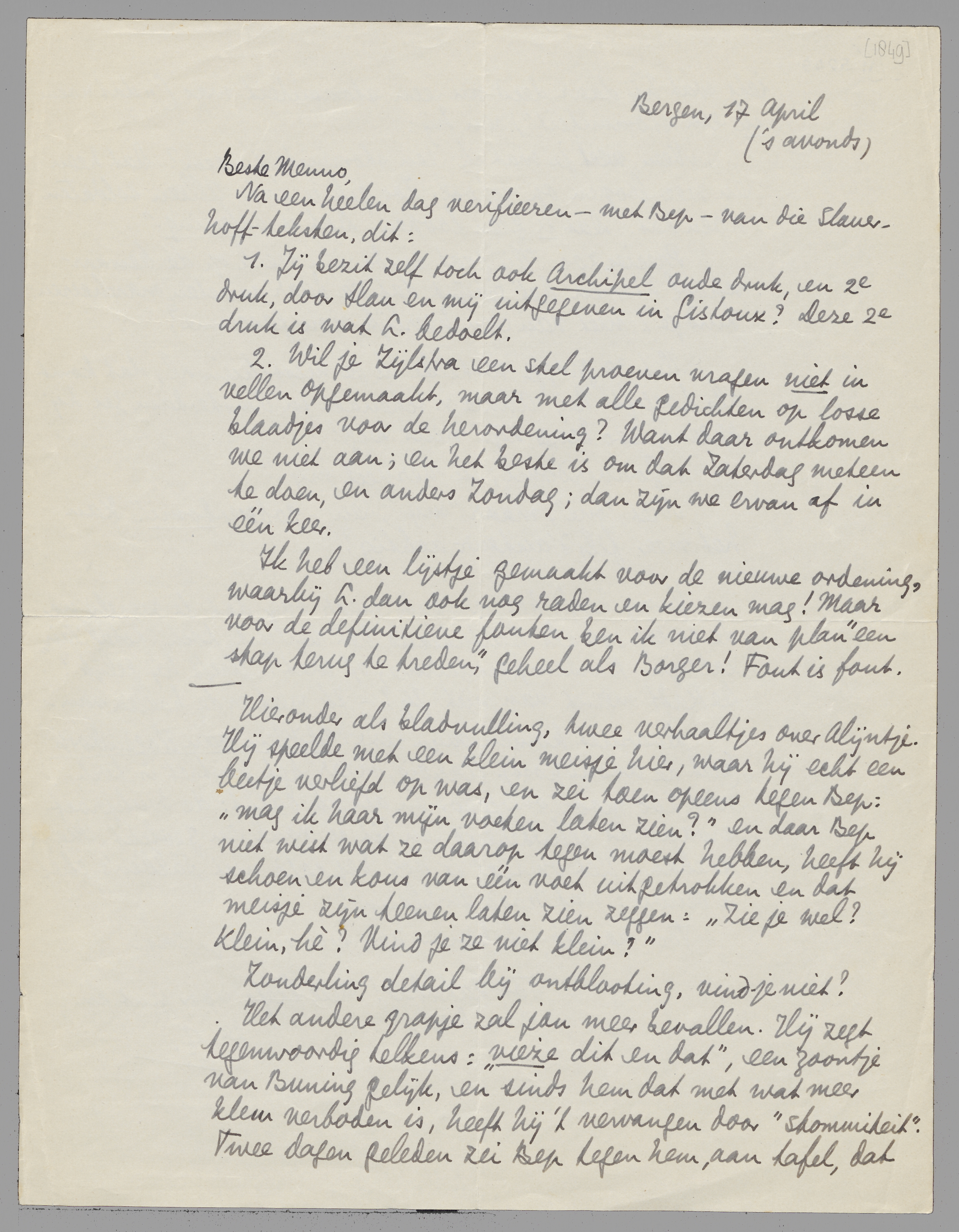 | 2. | Wil je Zijlstra een stel proeven vragen niet in vellen opgemaakt, maar met alle gedichten op losse blaadjes voor de herordening? Want daar ontkomen we niet aan; en het beste is om dat Zaterdag meteen te doen, en anders Zondag; dan zijn we ervan af in één keer. |