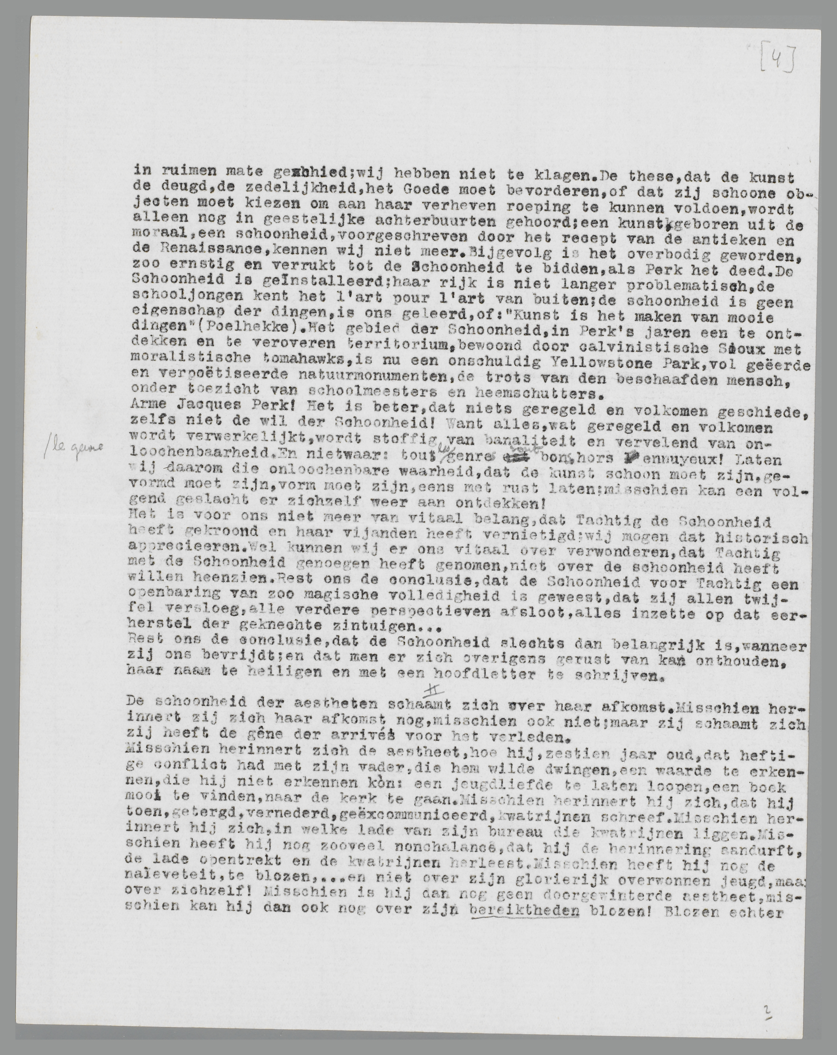 Arme Jacques Perk! Het is beter, dat niets geregeld en volkomen geschiede, zelfs niet de wil der Schoonheid! Want alles, wat geregeld en volkomen wordt verwerkelijkt, wordt stoffig van banaliteit en vervelend van onloochenbaarheid. En nietwaar: tous les genres sont bons hors le genre ennuyeux! Laten wij daarom die onloochenbare waarheid, dat de kunst schoon moet zijn, gevormd moet zijn, vorm moet zijn, eens met rust laten; misschien kan een volgend geslacht er zichzelf weer aan ontdekken!