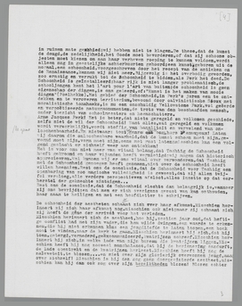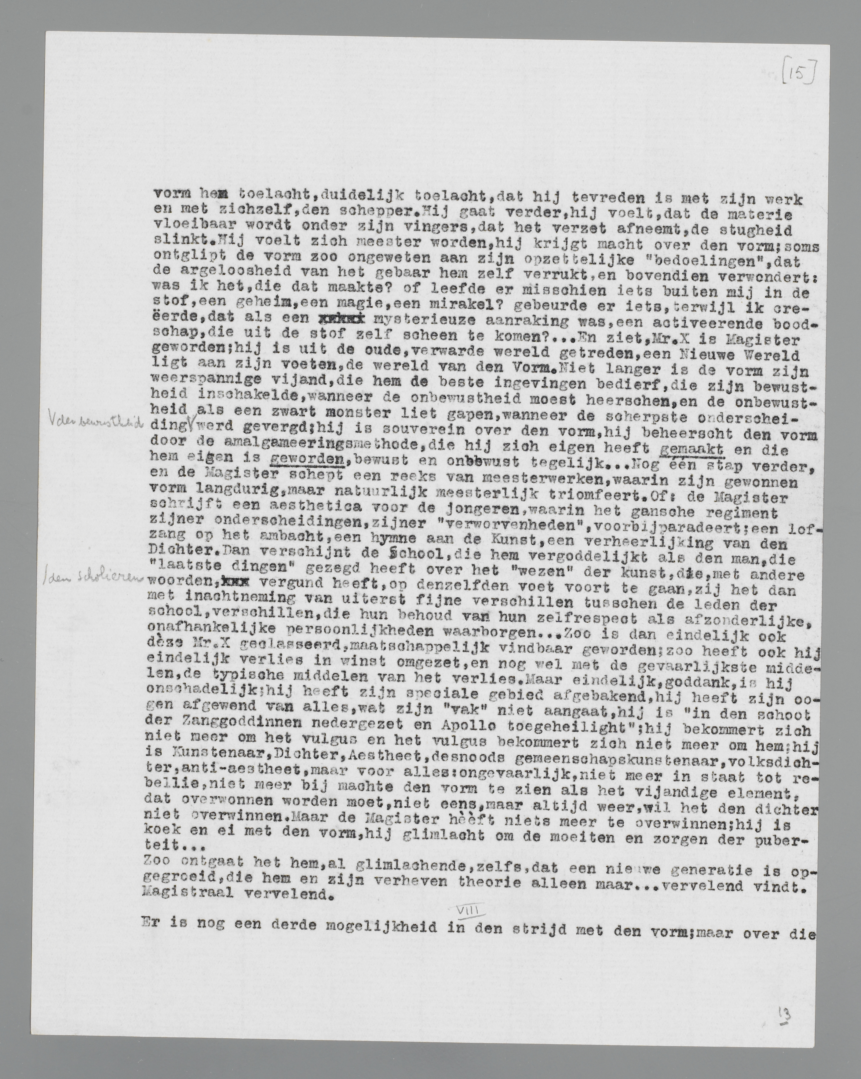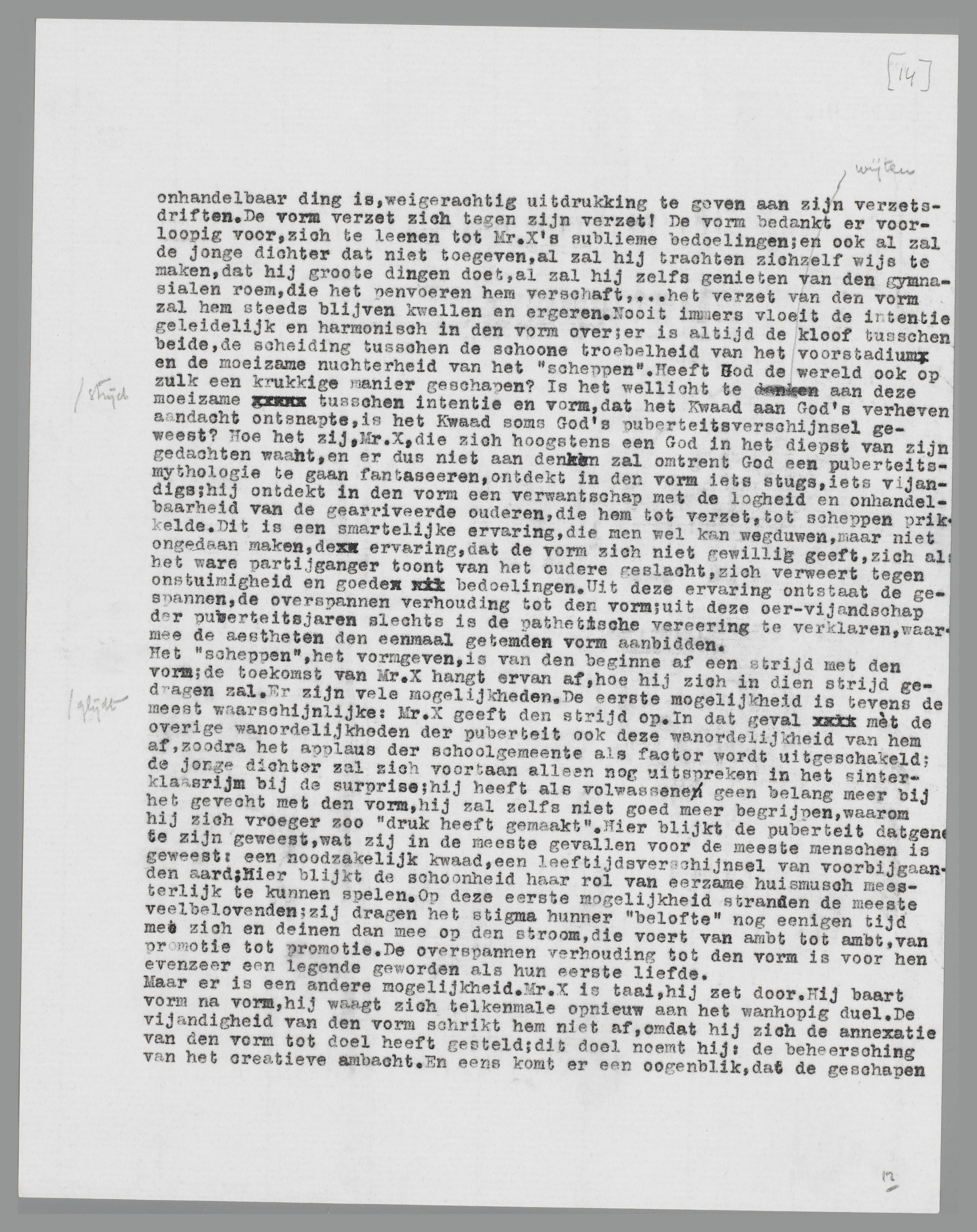 en ergeren. Nooit immers vloeit de intentie geleidelijk en harmonisch in den vorm over; er is altijd de kloof tusschen beide, de scheiding tusschen de schoone troebelheid van het voorstadium en de moeizame nuchterheid van het ‘scheppen’. Heeft God de wereld ook op zulk een krukkige manier geschapen? Is het wellicht te wijten aan deze moeizame strijd tusschen intentie en vorm, dat het Kwaad aan God's verheven aandacht ontsnapte, is het Kwaad soms God's puberteitsverschijnsel geweest?... Hoe het zij, mr. X., die zich hoogstens een God in het diepst van zijn gedachten waant, en er dus niet aan denken zal omtrent God een puberteits-mythologie te gaan fantaseeren, ontdekt in den vorm iets stugs, iets vijandigs; hij ontdekt in den vorm een verwantschap met de logheid en onhandelbaarheid van de gearriveerde ouderen, die hem tot verzet, tot scheppen prikkelde. Dit is een smartelijke ervaring, die men wel kan wegduwen, maar niet ongedaan maken, de ervaring, dat de vorm zich niet gewillig geeft, zich als het ware partijganger toont van het oudere geslacht, zich verweert tegen onstuimigheid en goede bedoelingen. Uit deze ervaring ontstaat de gespannen, de overspannen verhouding tot den vorm; uit deze oervijandschap der puberteitsjaren slechts is de pathetische vereering te verklaren, waarmee de aestheten later den eenmaal getemden vorm aanbidden.
