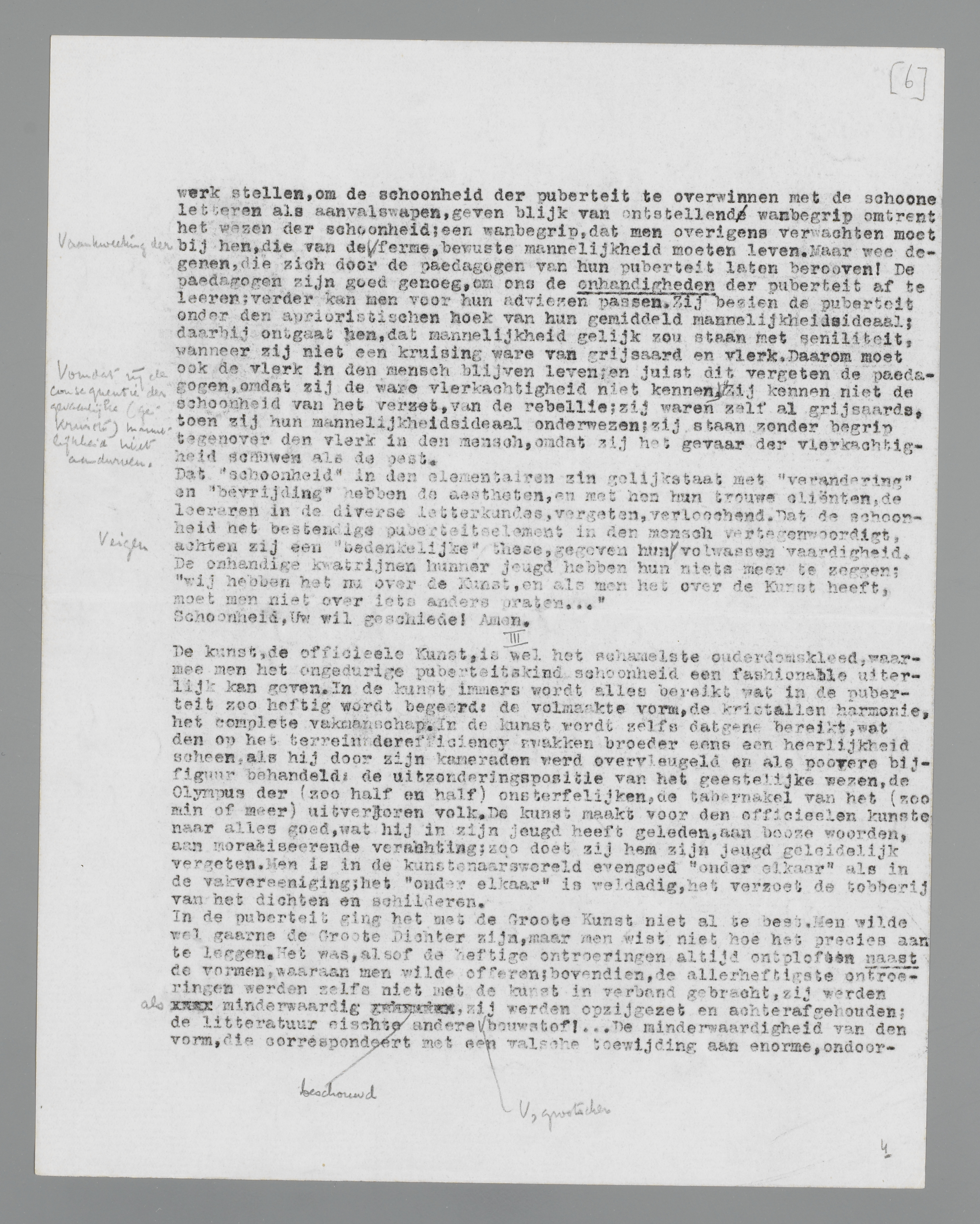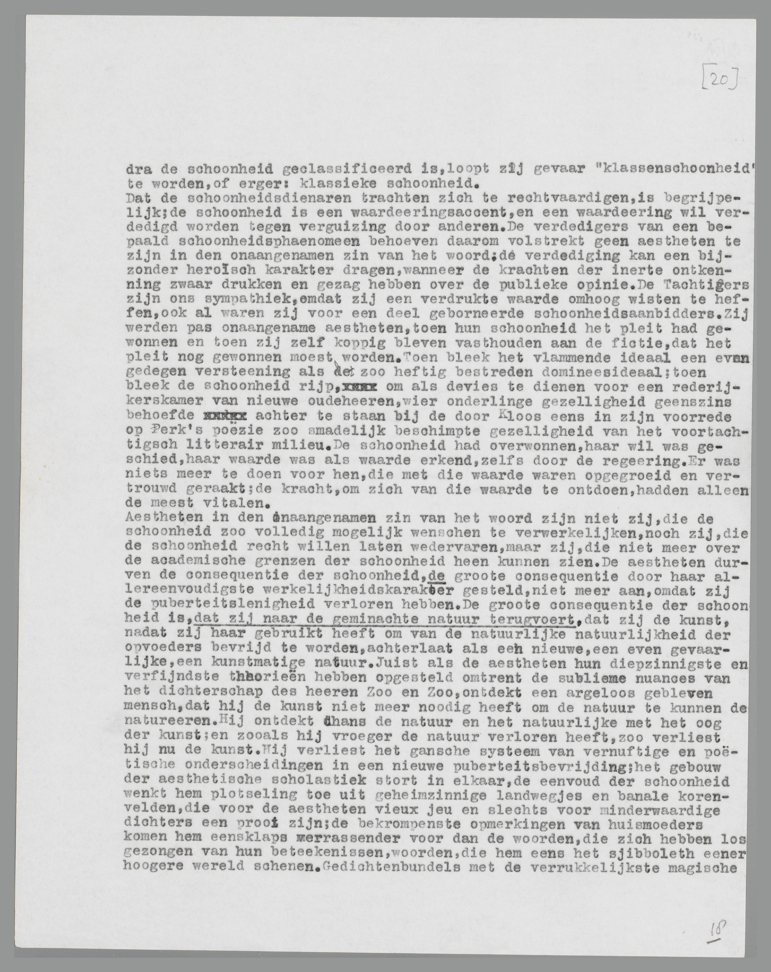‘verandering’ en ‘bevrijding’ hebben de aestheten, en met hen hun trouwe cliënten, de leeraren in de diverse letterkundes, vergeten, verloochend. Dat de schoonheid het bestendige puberteitselement in den mensch vertegenwoordigt, achten zij een ‘bedenkelijke’ these, gegeven hun eigen volwassen vaardigheid. De onhandige kwatrijnen hunner jeugd hebben hun niets meer te zeggen; ‘wij hebben het nu over de Kunst, en als men het over de Kunst heeft, moet men niet over iets anders praten....’