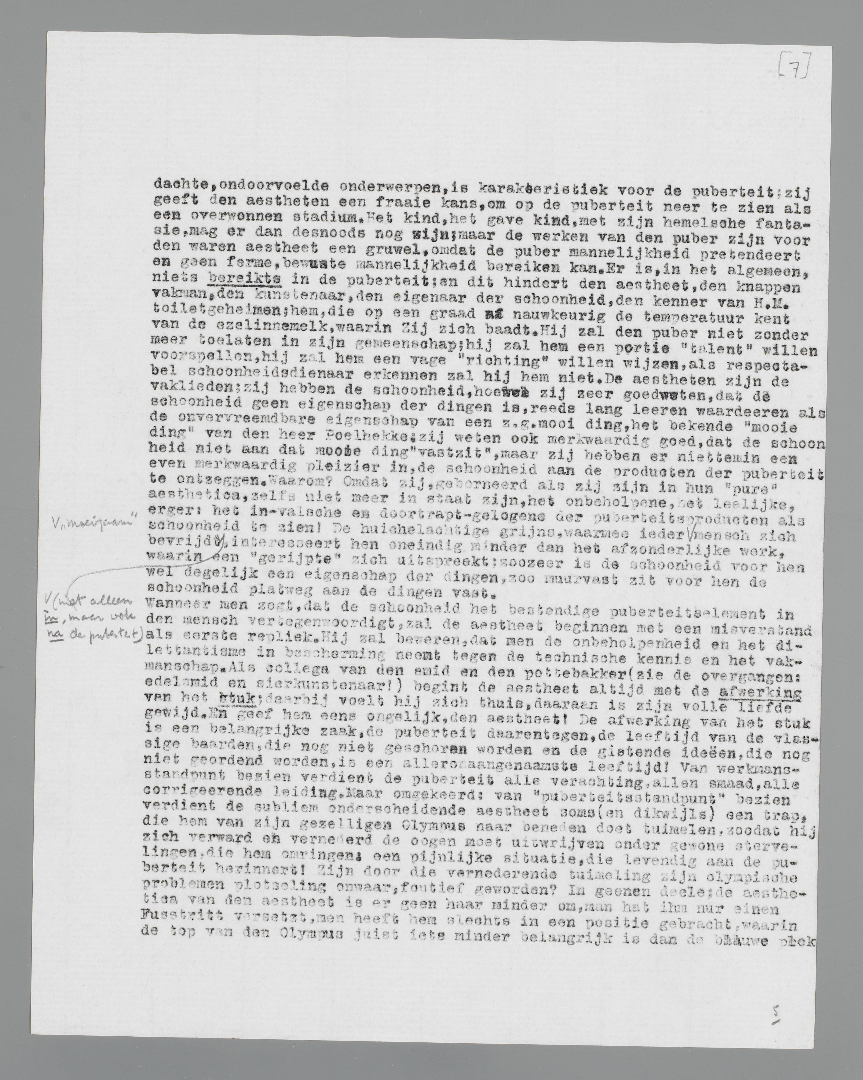 Wanneer men zegt, dat de schoonheid het bestendige puberteitselement in den mensch vertegenwoordigt, zal de aestheet beginnen met een misverstand als eerste repliek. Hij zal beweren, dat men de onbeholpenheid en het dilettantisme in bescherming neemt tegen de technische kennis en het vakmanschap. Als collega van den smid en den pottebakker (zie de overgangen: edelsmid en sierkunstenaar!) begint de aestheet altijd met de afwerking van het stuk; daarbij voelt hij zich thuis, daaraan is zijn volle liefde gewijd. En geef hem eens ongelijk, den aestheet! De afwerking van het stuk is een belangrijke zaak, de puberteit daarentegen, de leeftijd van de vlassige baarden, die nog niet geschoren worden en de gistende ideeën, die nog niet geordend worden, is een alleronaangenaamste leeftijd! Van werkmansstandpunt bezien verdient de puberteit alle verachting, allen smaad, alle corrigeerende leiding. Maar omgekeerd: van ‘puberteitsstandpunt’ bezien verdient de subliem onderscheidende aestheet soms (en dikwijls) een trap, die hem van zijn gezelligen Olympus naar beneden doet tuimelen, zoodat hij zich verward en vernederd de oogen moet uitwrijven onder gewone stervelingen, die hem omringen: een pijnlijke situatie, die levendig aan de puberteit herinnert! Zijn door die vernederende tuimeling zijn olympische problemen plotseling onwaar, foutief geworden? In geenen deele; de aesthetica van den aestheet is er geen haar minder om, man hat ihm nur einen Fusstritt versetzt, men heeft hem slechts in een positie gebracht, waarin de top van