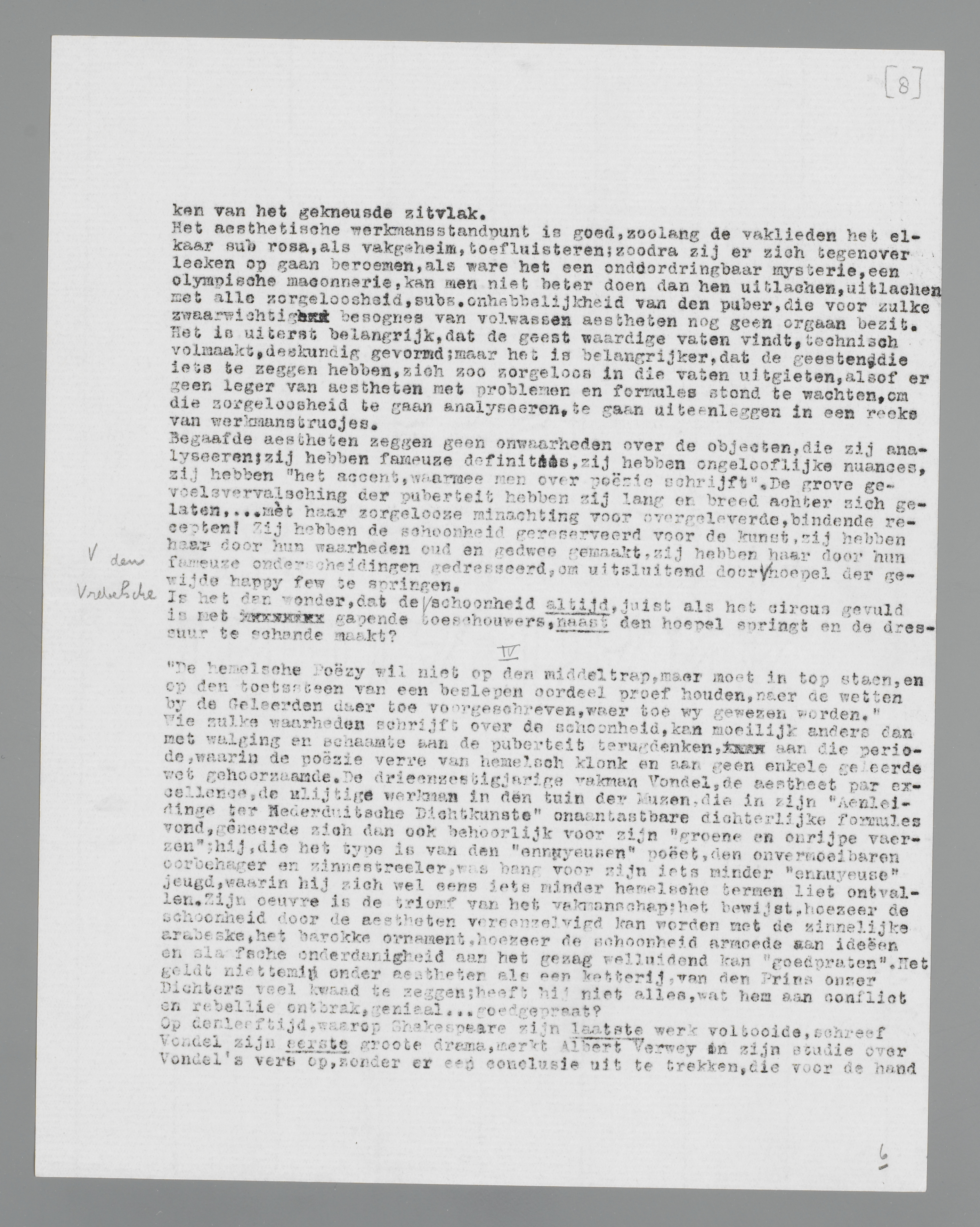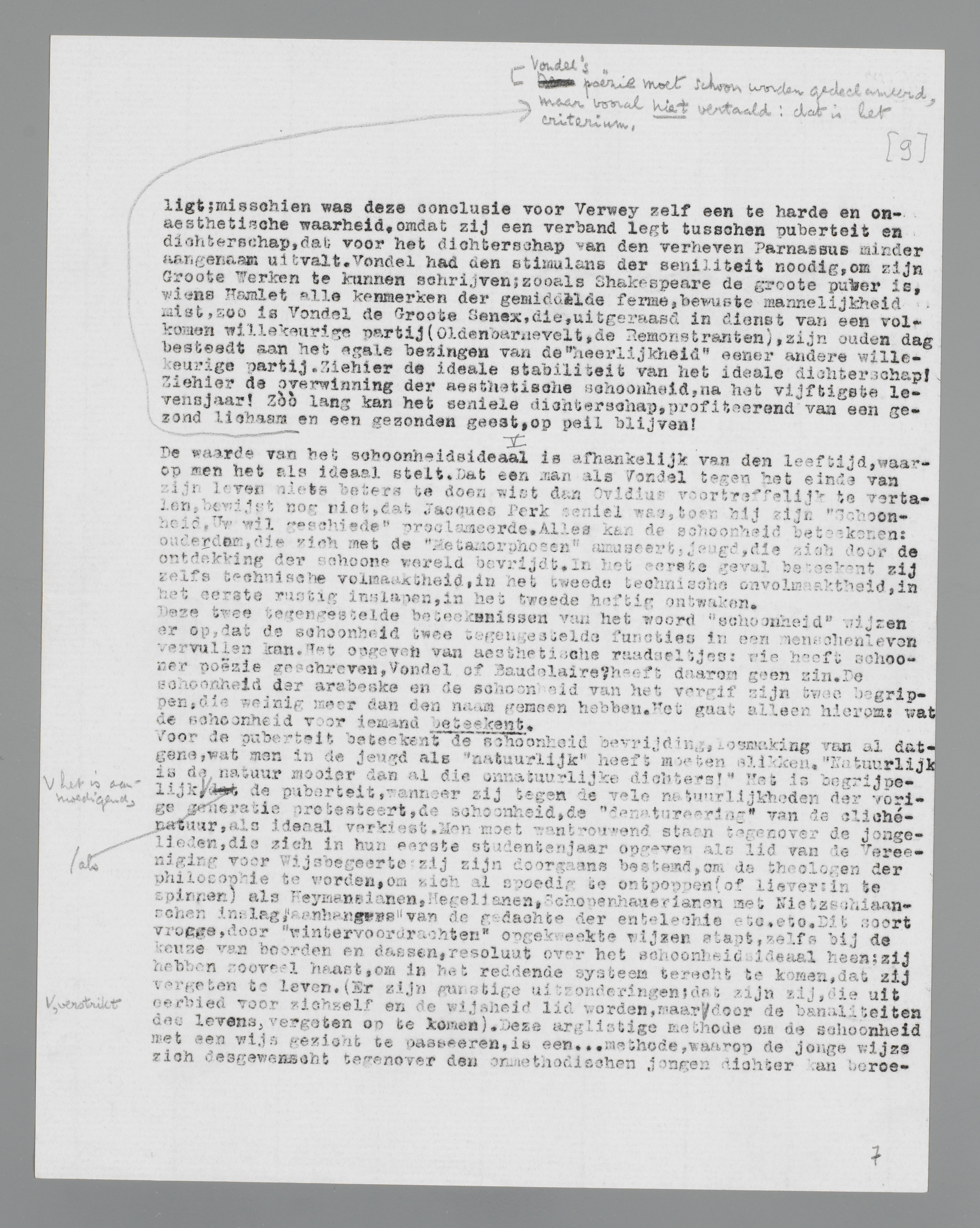 Wie zulke waarheden schrijft over de schoonheid, kan moeilijk anders dan met walging en schaamte aan de puberteit terugdenken, aan die periode, waarin de poëzie verre van hemelsch klonk en aan geen enkele geleerde wet gehoorzaamde. De drie en zestigjarige vakman Vondel, de aestheet par excellence, de vlijtige werkman in den tuin der Muzen, die in zijn ‘Aenleidinge ter Nederduitsche Dichtkunste’ onaantastbare dichterlijke formules vond, gêneerde zich dan ook behoorlijk voor zijn ‘groene en onrijpe vaerzen’; hij, die het type is van den ‘ennuyeusen’ poëet, den onvermoeibaren oorbehager en zinnestreeler, was bang voor zijn iets minder ‘ennuyeuse’ jeugd, waarin hij zich wel eens iets minder hemelsche termen liet ontvallen. Zijn oeuvre is de triomf van het vakmanschap; het bewijst, hoezeer de schoonheid door de aestheten vereenzelvigd kan worden met de zinnelijke arabeske, het barokke ornament, hoezeer de schoonheid armoede van ideeën en slaafsche onderdanigheid aan het gezag welluidend kan ‘goedpraten’. Het geldt niettemin onder aestheten als een ketterij, van den Prins onzer Dichters veel kwaad te zeggen; heeft hij niet alles, wat hem aan conflict en rebellie ontbrak, geniaal... goedgepraat?