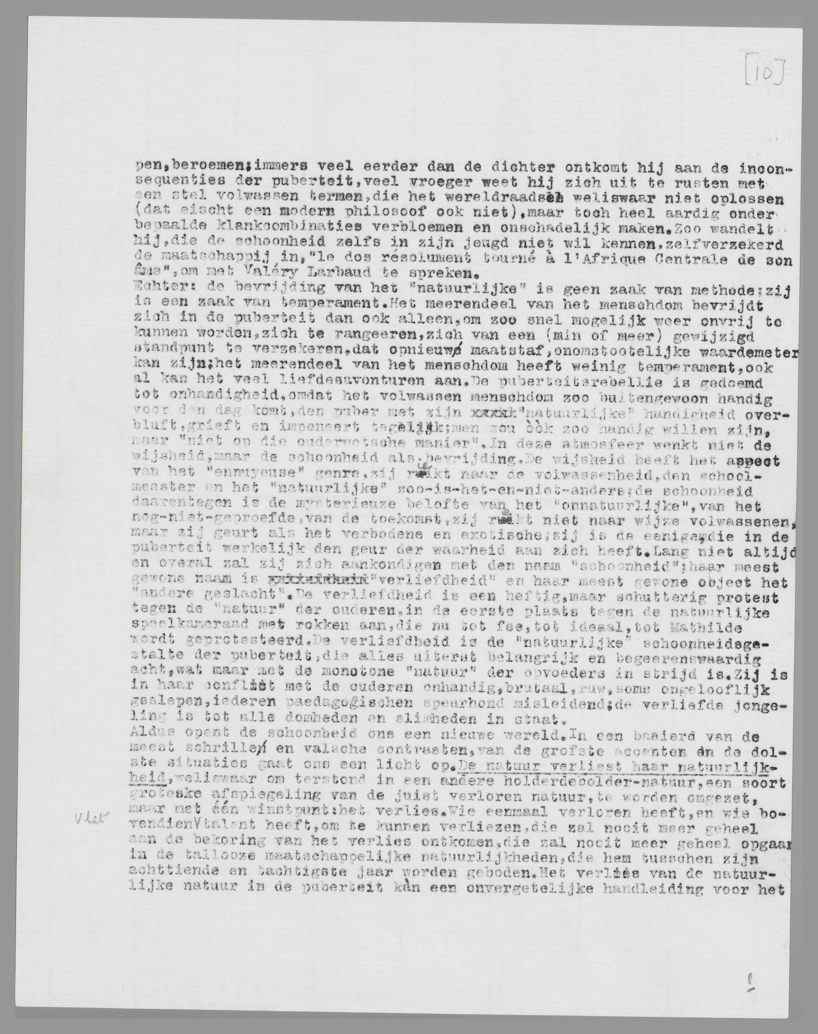 dooddrukken van de puberteit is het postulaat van den paedagoog, waarzonder hij niet kan opvoeden, waarzonder hij geen verzet kan uitroeien (‘de jeugd leiden’), waarzonder hij het gevaar der schoone rebellie niet kan smoren. Geen beter middel tegen het gevaar der schoonheid dan beleidvol, smaakvol, tactvol litteratuuronderwijs; geen tak van paedagogie kweekt doelmatiger pedanten, onnoozeler aestheten! De schoonheid der puberteit is niet de schoone litteratuur, maar de révolte zelf; daartegen vormen dan ook de schoone producten der letterkunde de beste remedie.