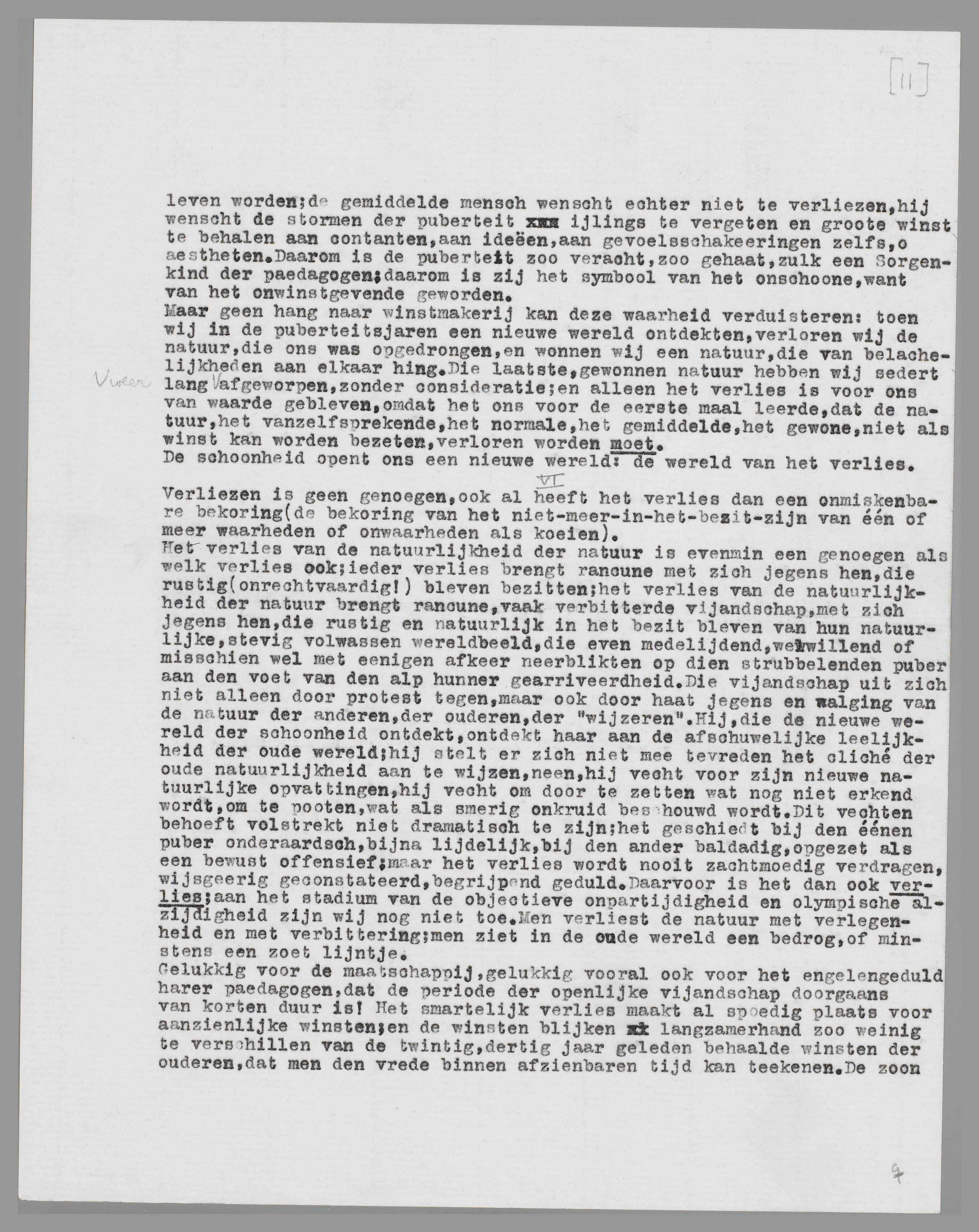 Maar geen hang naar winstmakerij kan deze waarheid verduisteren: toen wij in de puberteitsjaren een nieuwe wereld ontdekten, verloren wij de natuur, die ons was opgedrongen, en wonnen wij een natuur, die van belachelijkheden aan elkaar hing. Die laatste, gewonnen natuur hebben wij sedert lang weer afgeworpen, zonder consideratie; en alleen het verlies is voor ons van waarde gebleven, omdat het ons voor de eerste maal leerde, dat de natuur, het vanzelfsprekende, het normale, het gemiddelde, het gewone, niet als winst kan worden bezeten, verloren worden moet.