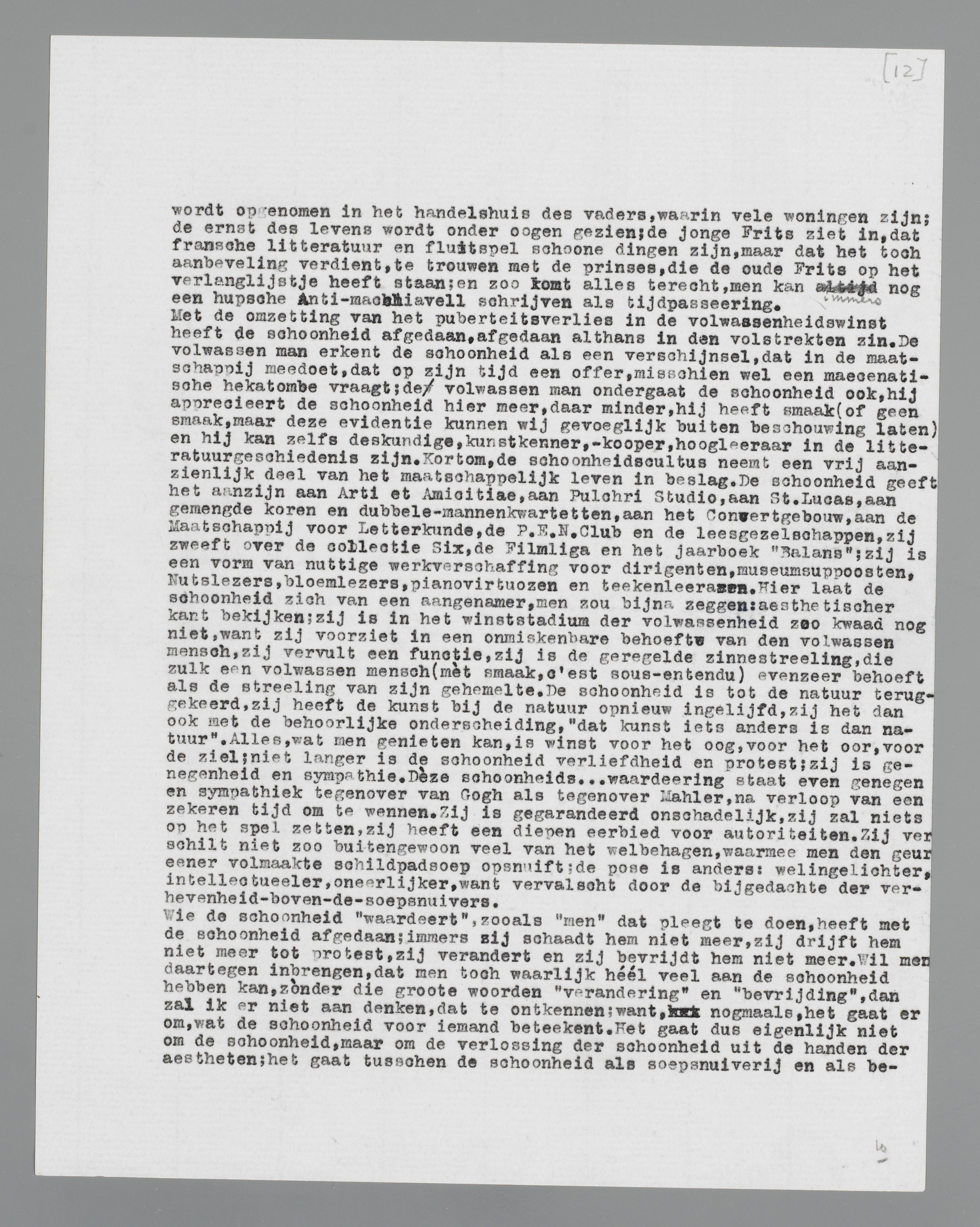 Met de omzetting van het puberteitsverlies in de volwassenheidswinst heeft de schoonheid afgedaan, afgedaan althans in den volstrekten zin. De volwassen man erkent de schoonheid als een verschijnsel, dat in de maatschappij meedoet, dat op zijn tijd een offer, misschien wel een maecenatische hekatombe vraagt; de volwassen man ondergaat de schoonheid ook, hij apprecieert de schoonheid hier meer, daar minder, hij heeft smaak (of geen smaak, maar deze evidentie kunnen wij gevoeglijk buiten beschouwing laten) en hij kan zelfs deskundige, kunstkenner, -kooper, hoogleeraar in de litteratuurgeschiedenis zijn. Kortom, de schoonheidscultus neemt een vrij aanzienlijk deel van het maatschappelijk leven in beslag. De schoonheid geeft het aanzijn aan Arti et Amicitiae, aan Pulchri Studio, aan St. Lucas, aan gemengde koren en dubbele-mannenkwartetten, aan het Concertgebouw, aan de Maatschappij voor Letterkunde, de P.E.N. Club en de leesgezelschappen, zij zweeft over de collectie Six, de Filmliga en het jaarboek ‘Balans’; zij is een vorm van nuttige werkverschaffing voor dirigenten, museumsuppoosten, Nutslezers, bloemlezers, pianovirtuozen en teekenleeraren. Hier laat de