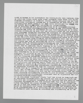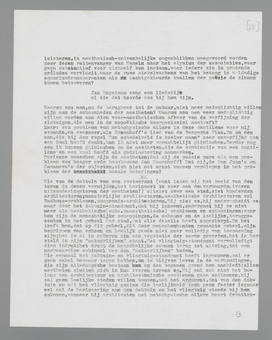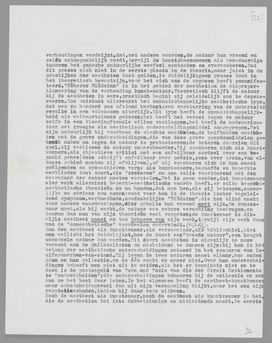 Wie van de daktuin van een restaurant (want laten wij het beeld van den toren in dezen vermijden, het herinnert te zeer aan den vermaarden ivoren uitzonderingstoren der aestheten!) uitziet over een stad, ziet honderden architecturen; monsterlijke architecturen, aesthetische architecturen vol Bauhaus-problemen, compromis-architecturen. Hij ziet ze, hij onderscheidt ze; maar door het daktuinstandpunt, dat hij inneemt, ondergaat hij ze niet meer als aesthetische (subs. onaesthetische) problemen en oplossingen; voor hem zijn de menschelijke scheppingen, de schoone en de leelijke, teruggezonken in het geheel der stad, dat alle details heeft opgeslorpt. En het treft hem, dat op dit geheel, dit door menschenhanden gemaakte geheel, zijn begrippen van schoon en leelijk reeds niet meer volledig van toepassing zijn; het is al in zekeren zin een vegetatie der aarde geworden, het is hersteld in zijn ‘natuurlijken’ staat. Het vliegtuig-standpunt vervolledigt dien indruk; het drukt de menschelijke vormen terug tot uitslag, tot een merkwaardigen schimmel van den ‘natuurlijken’ bodem.