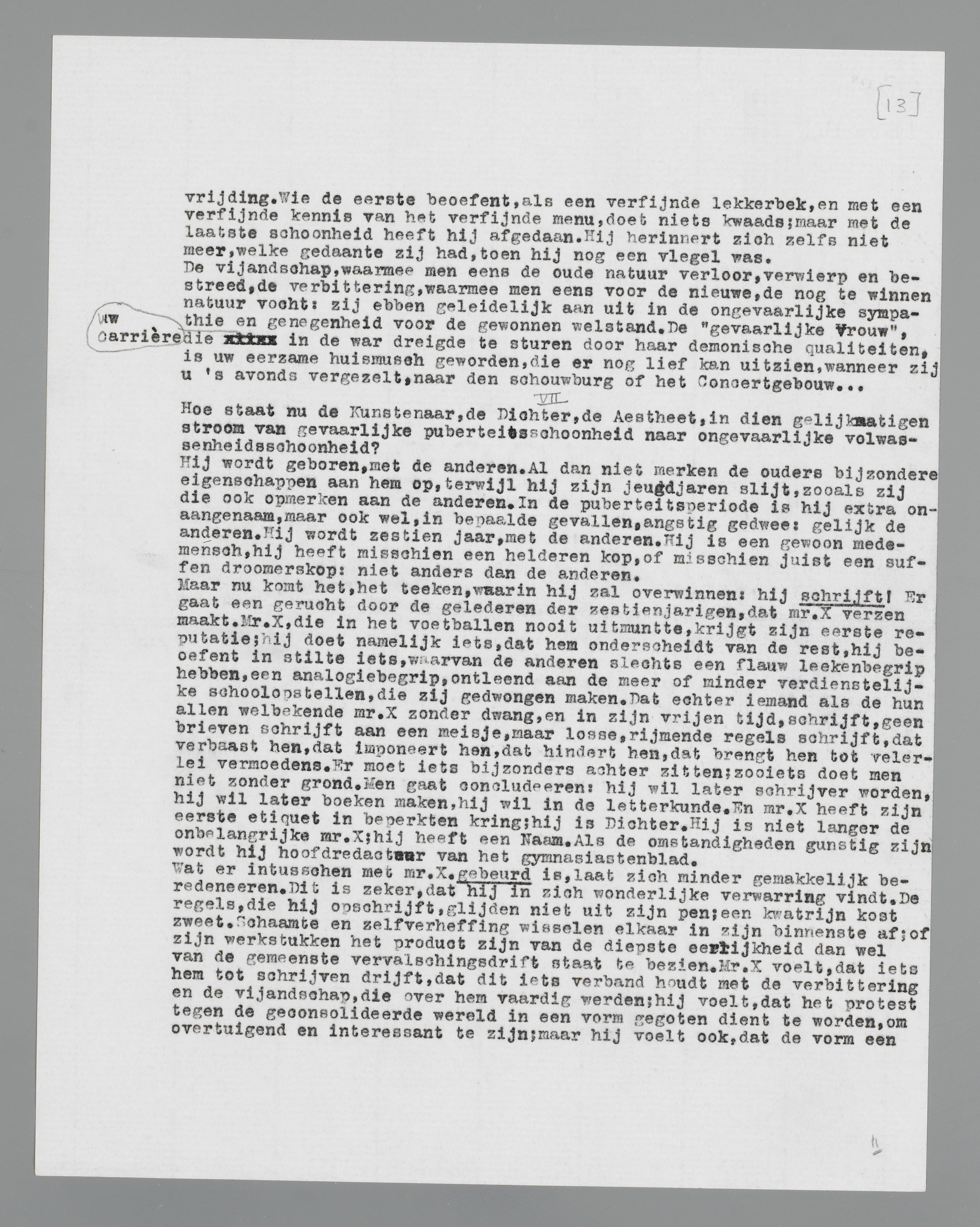 Het ‘scheppen’, het vormgeven, is van den beginne af een strijd met den vorm; de toekomst van mr. X. hangt ervan af, hoe hij zich in dien strijd gedragen zal. Er zijn vele mogelijkheden. De eerste mogelijkheid is tevens de meest waarschijnlijke: Mr. X. geeft den strijd op. In dat geval glijdt mèt de overige wanordelijkheden der puberteit ook deze wanordelijkheid van hem af, zoodra het applaus der schoolgemeente als factor wordt uitgeschakeld; de jonge dichter zal zich voortaan alleen nog uitspreken in sinterklaasrijm of journalistiek; hij heeft als volwas-