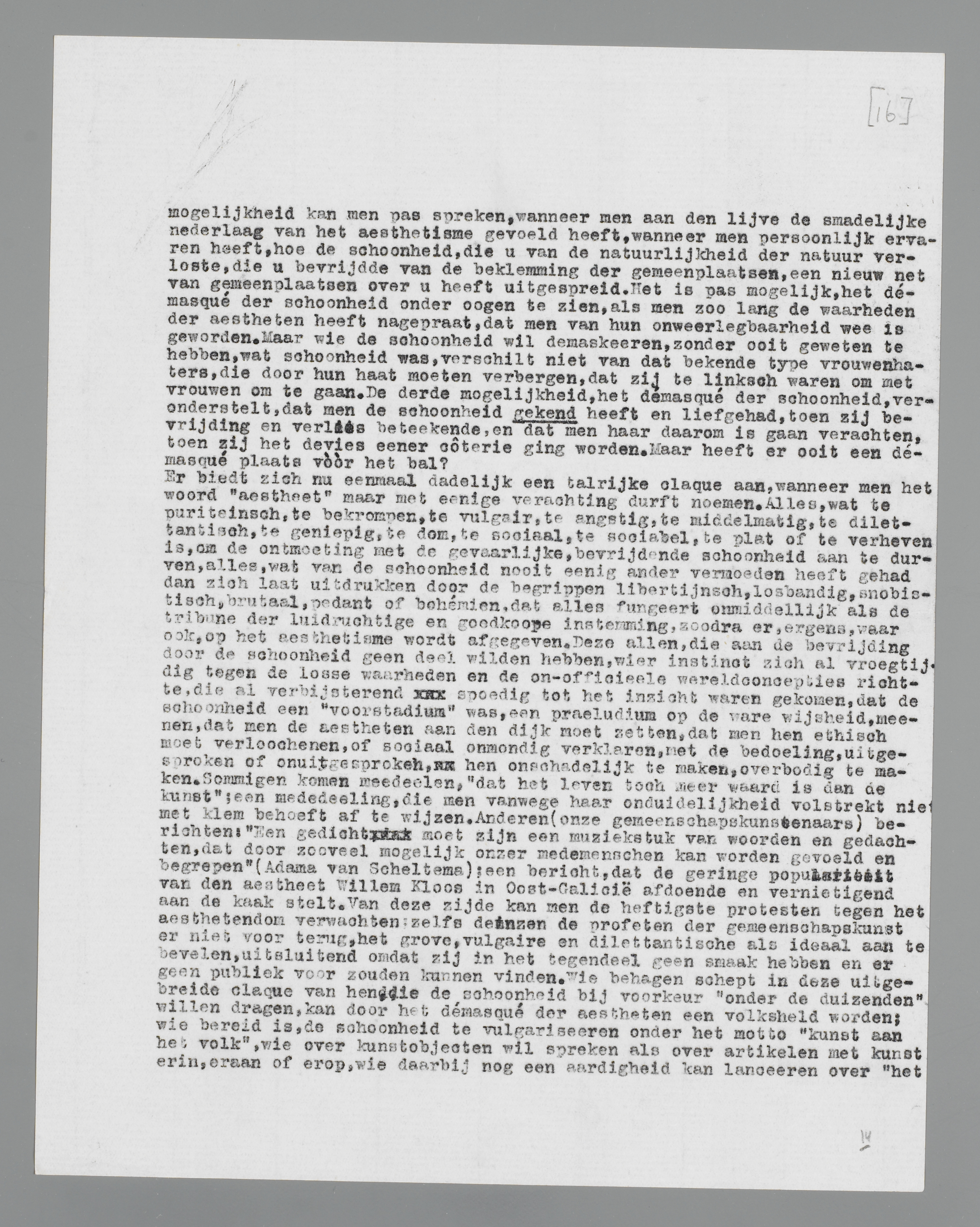 Een bestrijding der aestheten, zonder vooropgezette afgunst begonnen, zal op een zeker moment steeds het aanzien krijgen van een hartstochtelijke verdediging der aestheten; zij zal bedriegelijk gelijken op een uiterst aesthetische ‘defense of poetry’. Men kan immers niet meer terug, als men van de aesthetische verfijningen geproefd heeft; en men wil ook niet meer terug naar een stadium van onverfijndheid, dat evengoed, maar ook even slecht is als het verfijnde. Of de verfijning een zegen is dan wel een gif, kan in het midden gelaten worden; zij is een feit, en zelfs een gemeenschapskunstenaar kan haar niet geheel missen. Het is een feit, dat de aestheten gelijk hebben voor de meest verfijnden en dat de minder verfijnden niet kunnen beoordeelen, òf zij gelijk hebben.