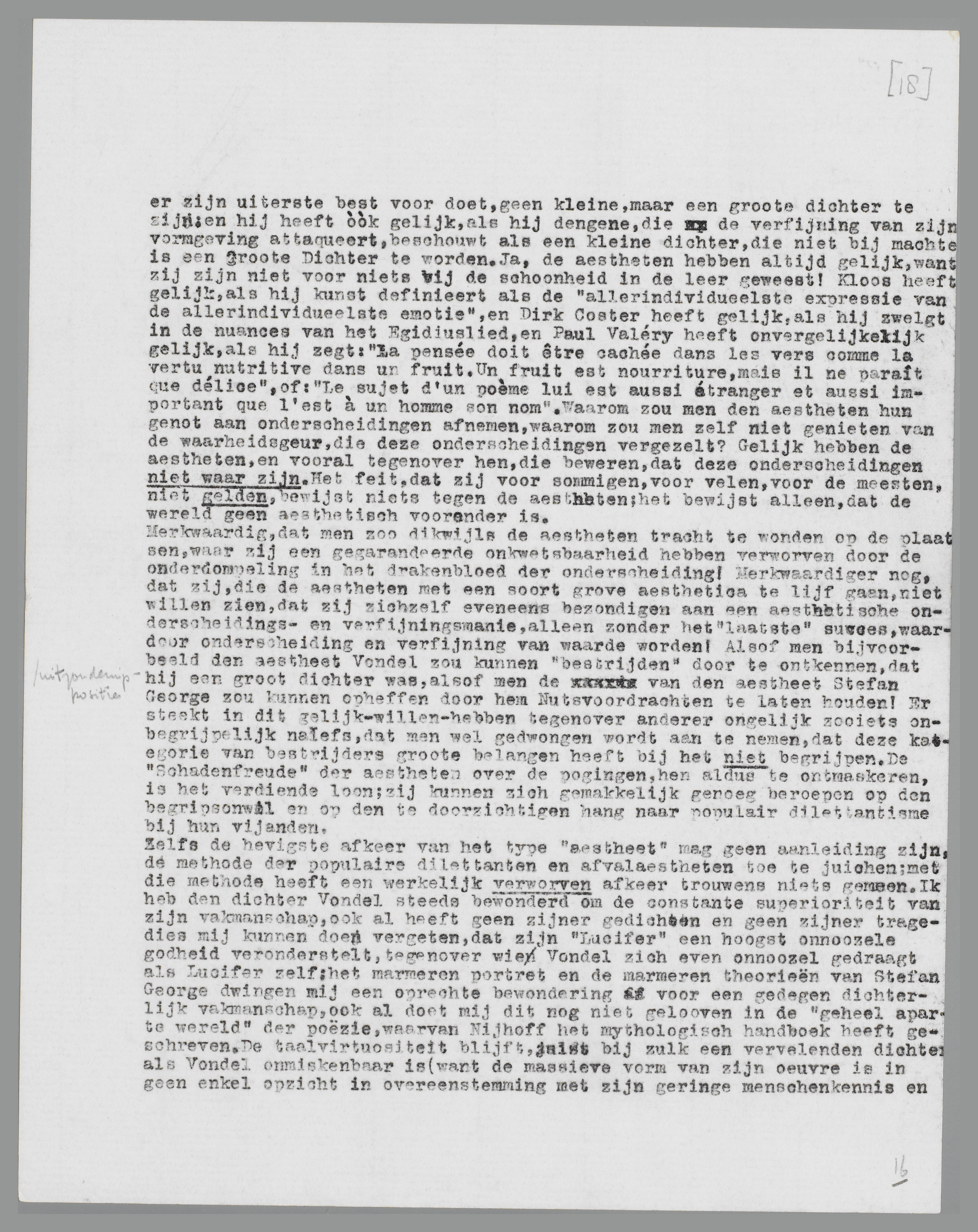 Zelfs de hevigste afkeer van het type ‘aestheet’ mag geen aanleiding zijn, de methode der populaire dilettanten en afval-aestheten toe te juichen; met die methode heeft een werkelijk verworven afkeer trouwens niets gemeen. Ik heb den dichter Vondel steeds bewonderd om de constante superioriteit van zijn vakmanschap, ook al heeft geen zijner gedichten en geen zijner tragedies mij kunnen doen vergeten, dat zijn ‘Lucifer’ een hoogst onnoozele godheid veronderstelt, tegenover wie Vondel zich even onnoozel gedraagt als Lucifer zelf; het marmeren portret en de marmeren theorieën van Stefan George dwingen mij een oprechte bewondering af voor een gedegen dichterlijk vakmanschap, ook al doet mij dit nog niet gelooven in de ‘geheel aparte wereld’ der poëzie, waaruit Nijhoff op Dinsdag het goddelijke ‘Wilhelmus’ zingt. De taalvirtuositeit blijft, juist bij zulk een vervelenden dichter als Vondel onmiskenbaar is (want de massieve vorm van zijn oeuvre is in geen enkel opzicht in overeenstemming met zijn geringe menschenkennis en zijn intellectueele slaafschheid), een wonder, dat weliswaar nooit een ziel in brand zal steken, maar dat toch het werk precies boven de rhetoriek uitheft. Vondel, als mensch volkomen onoorspronkelijk, als dichter volkomen virtuoos, is misschien wel één der meest karakteristieke exempelen van een zuiver aesthetische ‘grootheid’, die men onophoudelijk erkent, en onophou-