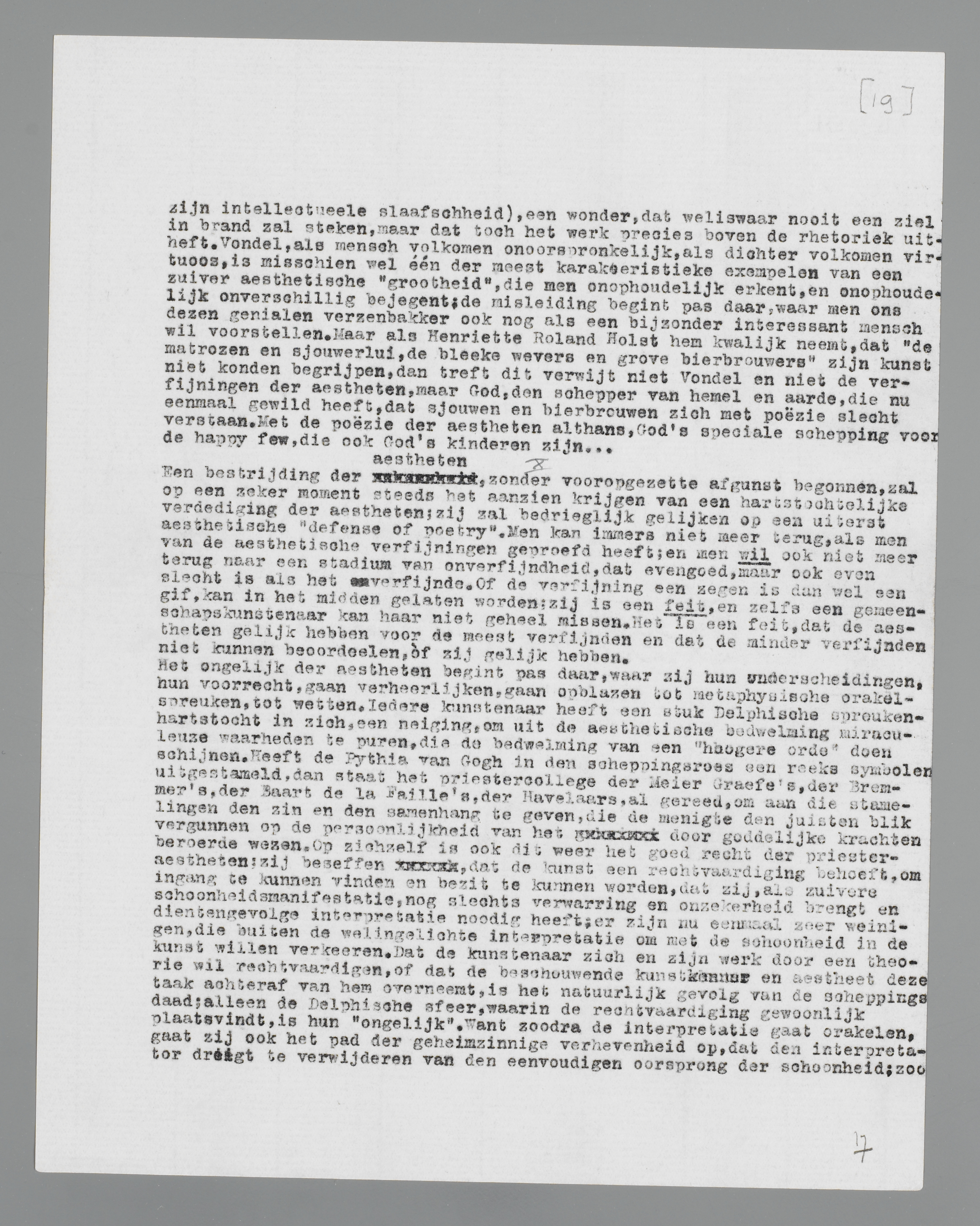 delijk onverschillig bejegent; de misleiding begint pas daar, waar men ons dezen genialen verzenbakker ook nog als een bijzonder interessant mensch wil voorstellen. Maar als Henriëtte Roland Holst hem kwalijk neemt, dat ‘de matrozen en sjouwerlui, de bleeke wevers en grove bierbrouwers’ zijn kunst niet konden begrijpen, dan treft dit verwijt niet Vondel en niet de verfijningen der aestheten, maar God, den schepper van hemel en aarde, die nu eenmaal gewild heeft, dat sjouwen en bierbrouwen zich met poëzie slecht verstaan. Met de poëzie der aestheten althans, God's speciale schepping voor de happy few, die ook God's kinderen zijn....