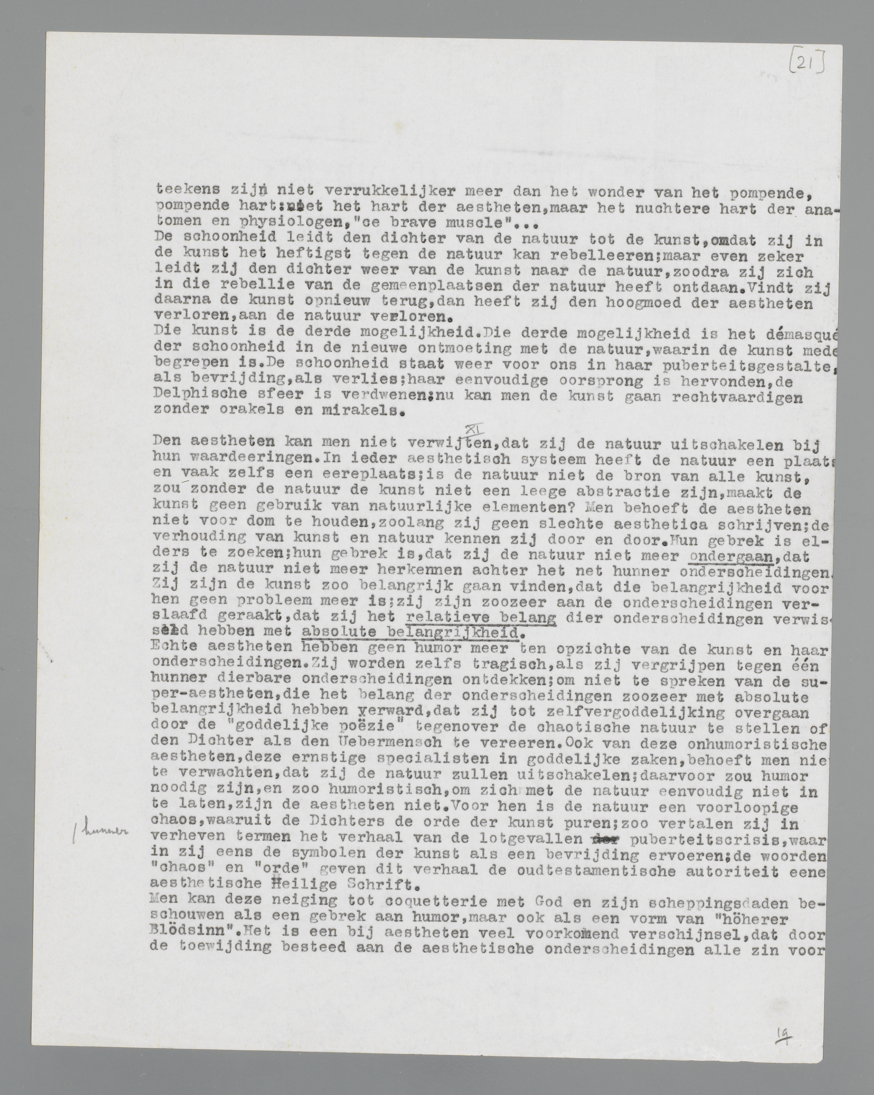 Echte aestheten hebben geen humor meer ten opzichte van de kunst en haar onderscheidingen. Zij worden zelfs tragisch, als zij vergrijpen tegen één hunner dierbare onderscheidingen ontdekken; om niet te spreken van de super-aestheten, die het belang der onderscheidingen zoozeer met absolute belangrijkheid hebben verward, dat zij tot zelfvergoddelijking overgaan door de ‘goddelijke poëzie’ tegenover de chaotische natuur te stellen of den Dichter als den Uebermensch te vereeren. Ook van deze onhumoristische aestheten, deze ernstige specialisten in goddelijke zaken, behoeft men niet te verwachten, dat zij de natuur zullen uitschakelen; daarvoor zou humor noodig zijn, en zoo humoristisch, om zich met de natuur eenvoudig niet in te laten, zijn de aestheten niet. Voor hen is de natuur een voorloopige chaos, waaruit de Dichters de orde der kunst puren; zoo vertalen zij in verheven termen
