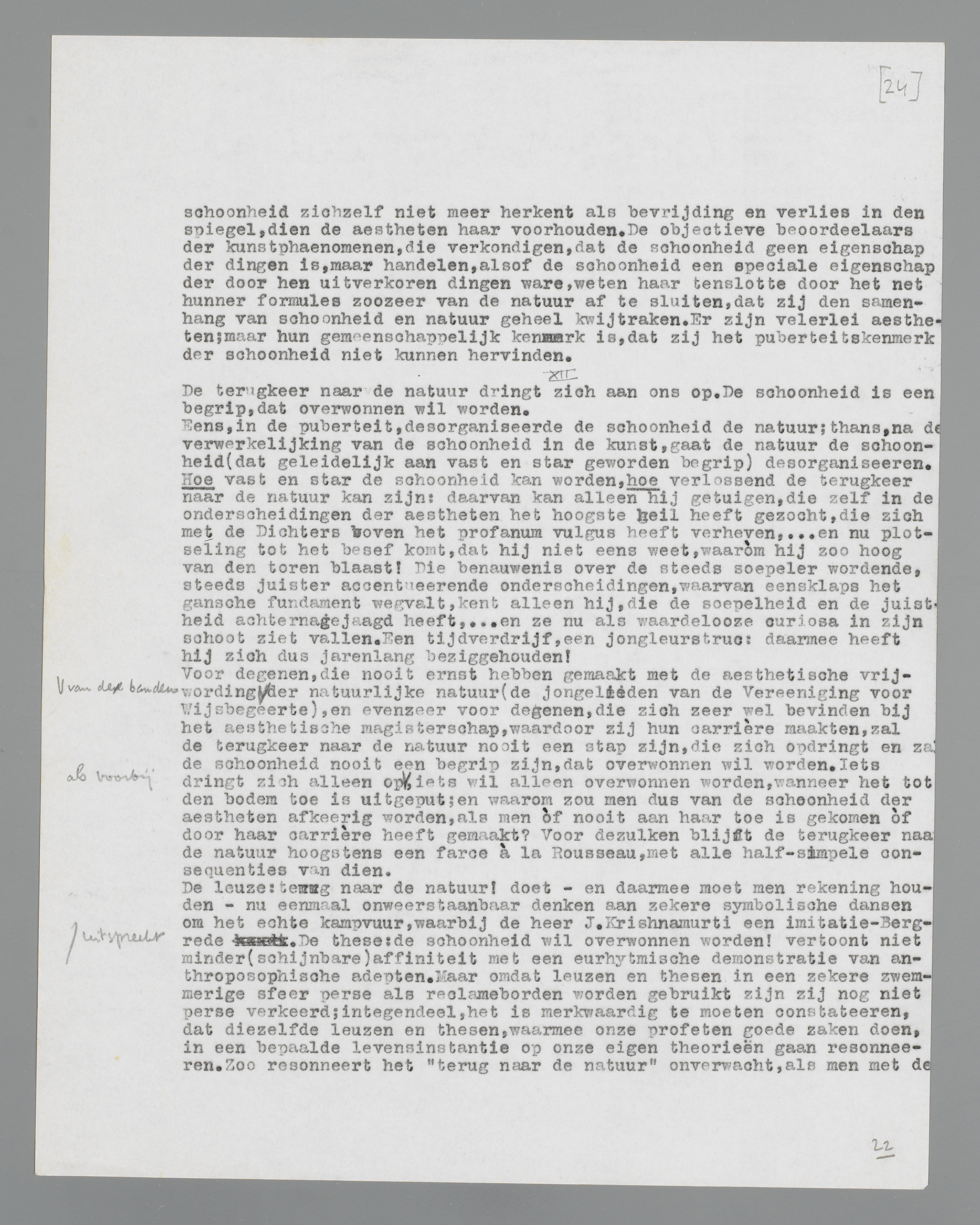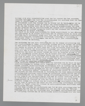 De leuze: terug naar de natuur! doet - en daarmee moet men rekening houden - nu eenmaal onweerstaanbaar denken aan zekere symbolische dansen om het echte kampvuur, waarbij de heer J. Krishnamurti een imitatie-Bergrede uitspreekt. De these: de schoonheid wil overwonnen worden! vertoont niet minder (schijnbare) affiniteit met eurhytmische armzwaaierij van anthroposophische adepten. Maar omdat leuzen en thesen in een zekere zwemmerige sfeer per se als reclameborden worden gebruikt zijn zij nog niet per se verkeerd; integendeel, het is merkwaardig te moeten constateeren, dat diezelfde leuzen en thesen, waarmee onze profeten goede zaken doen, in een bepaalde levensinstantie op onze eigen theorieën gaan resonneeren. Zoo resonneert het ‘terug naar de natuur’ onverwacht, als men met de natuur meent afgerekend te hebben; zoo resonneert het ‘de schoonheid wil overwonnen worden’, wanneer men in de schoonheid de hoogste bevrediging meent te hebben gevonden. Over het gehalte dier bepalingen in een andere sfeer is daarmee niets gezegd; zij resonneeren, zij duiden een onvermijdelijke reactie aan in onze sfeer, dat is de hoofdzaak.