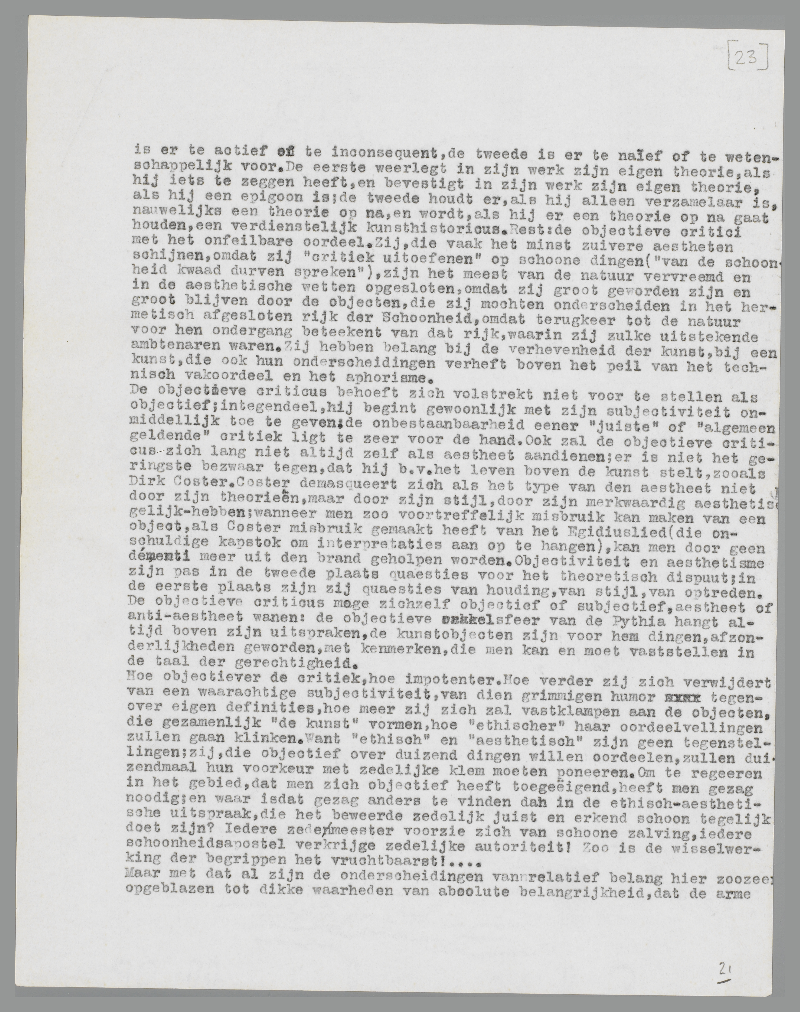 De objectieve criticus behoeft zich volstrekt niet voor te stellen als objectief; integendeel, hij begint gewoonlijk met zijn subjectiviteit onmiddellijk toe te geven; de onbestaanbaarheid eener ‘juiste’ of ‘algemeen geldende’ critiek ligt te zeer voor de hand. Ook zal de objectieve criticus zich lang niet altijd zelf als aestheet aandienen; er is niet het geringste bezwaar tegen, dat hij b.v. het leven boven de kunst stelt, zooals Dirk Coster. Coster demasqueert zich als het type van den aestheet niet door zijn theorieën, maar door zijn stijl, door zijn merkwaardig aesthetisch gelijk-hebben; wanneer men zoo voortreffelijk misbruik kan maken van een object, als Coster misbruik ge-