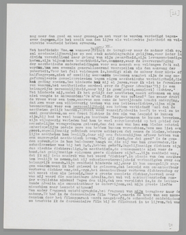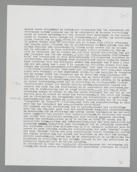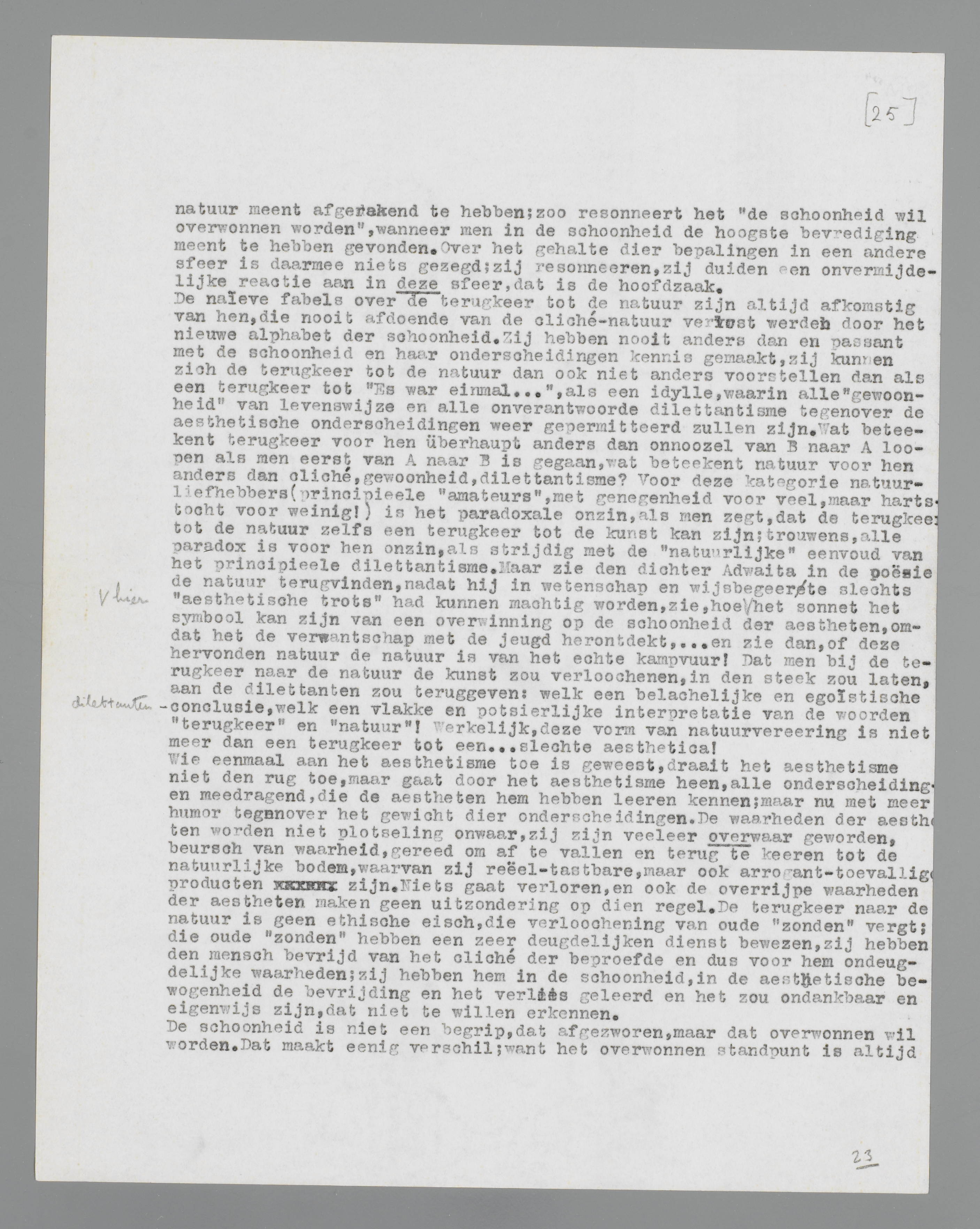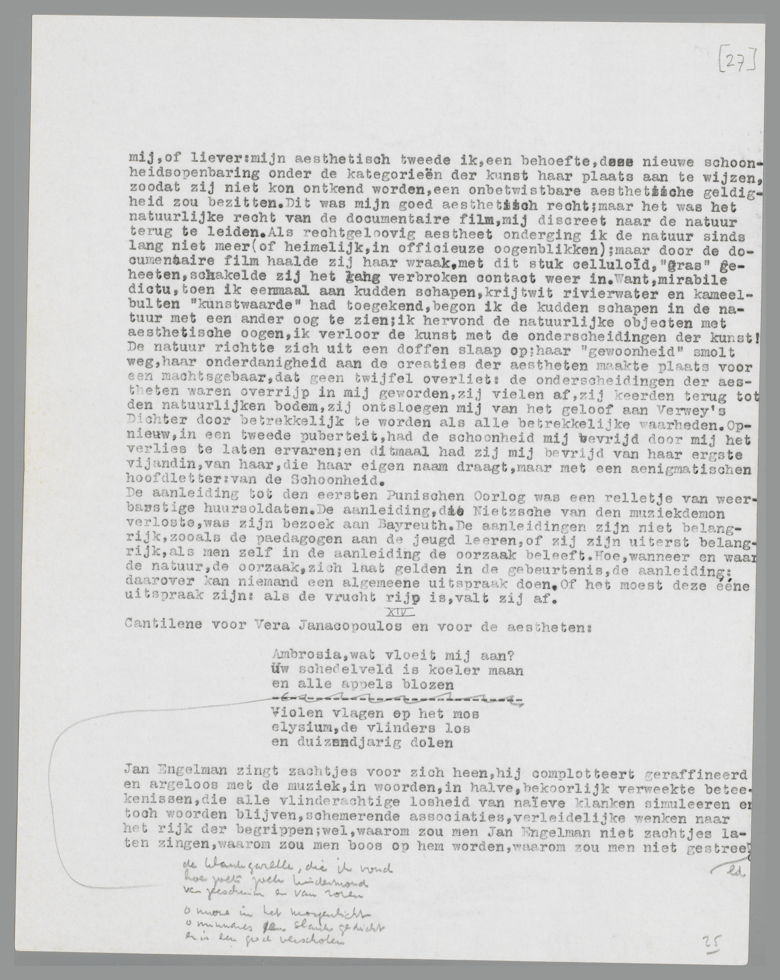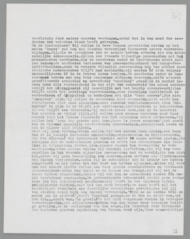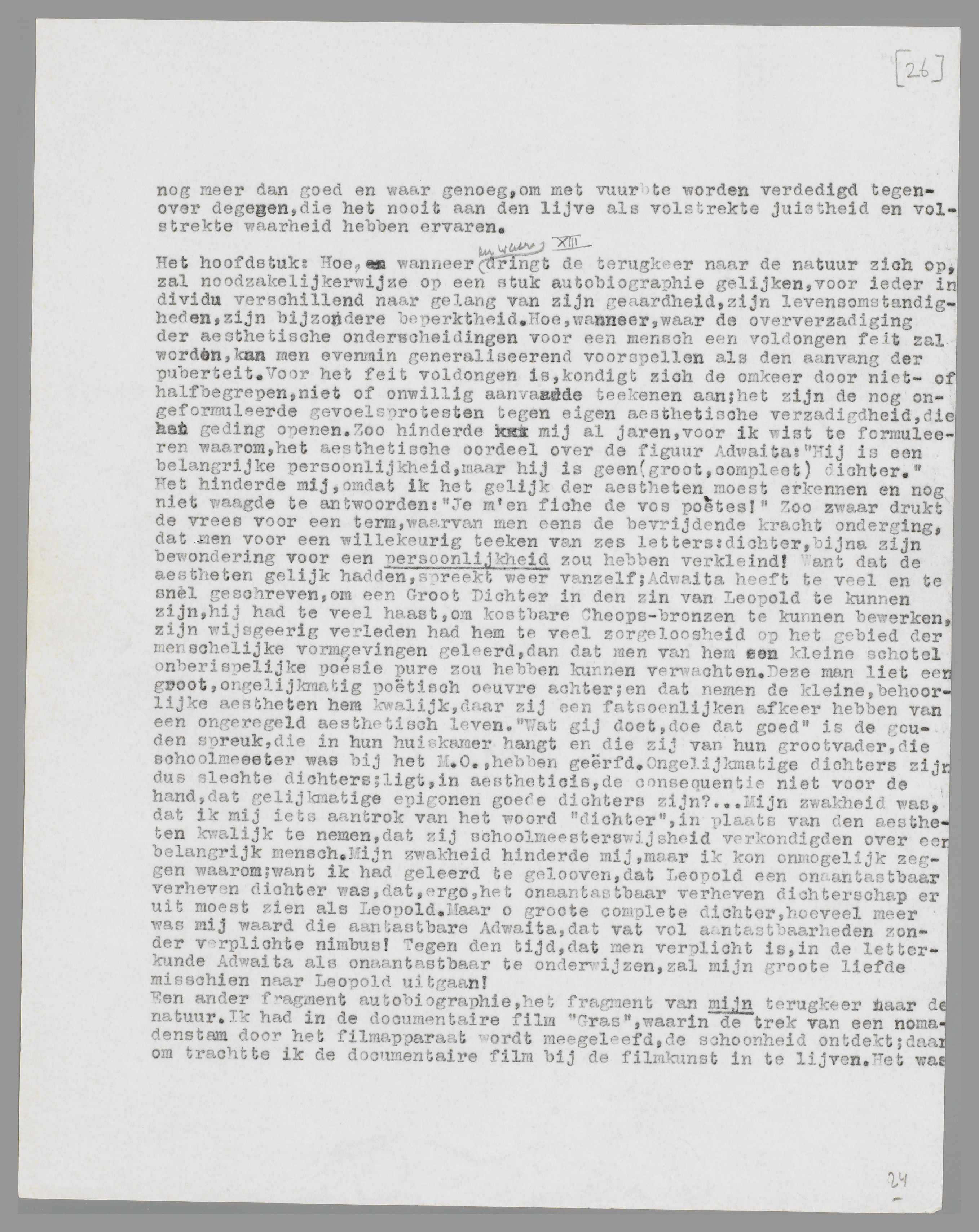 Een ander fragment autobiographie, het fragment van mijn terugkeer naar de natuur. Ik had in de documentaire film ‘Gras’, waarin de trek van een nomadenstam door het filmapparaat wordt meegeleefd, de schoonheid ontdekt; daarom trachtte ik de documentaire film bij de filmkunst in te lijven. Het was mij, of liever: mijn aesthetisch tweede ik, een behoefte, deze nieuwe schoonheidsopenbaring onder de kategorieën der kunst haar plaats aan te wijzen, zoodat zij niet kon ontkend worden, een onbetwistbare aesthetische geldigheid zou bezitten. Dit was mijn goed aesthetisch recht; maar het was het natuurlijke recht van de documentaire film, mij discreet naar de natuur terug te leiden. Als rechtgeloovig aestheet onderging ik de natuur sinds lang niet meer (of heimelijk, in officieuze oogenblikken); maar door de documentaire film haalde zij haar wraak, met dit stuk celluloid, ‘Gras’ geheeten, schakelde zij het lang verbroken contact weer in. Want, mirabile dictu, toen ik eenmaal aan kudden schapen, krijtwit rivierwater en kameelbulten ‘kunstwaarde’ had toegekend, begon ik de kudden schapen in de natuur met een ander oog te zien; ik hervond de natuurlijke objecten met aesthetische oogen, ik verloor de kunst met de onderscheidingen der kunst! De natuur richtte zich uit een doffen slaap op; haar ‘gewoonheid’ smolt weg, haar onderdanigheid aan de creaties der aestheten maakte plaats voor een machtsgebaar, dat geen twijfel overliet: de onderscheidingen der aestheten waren overrijp in mij geworden, zij vielen af, zij keerden terug tot den natuurlijken bodem, zij ontsloegen mij van het geloof aan Verwey's Dichter door