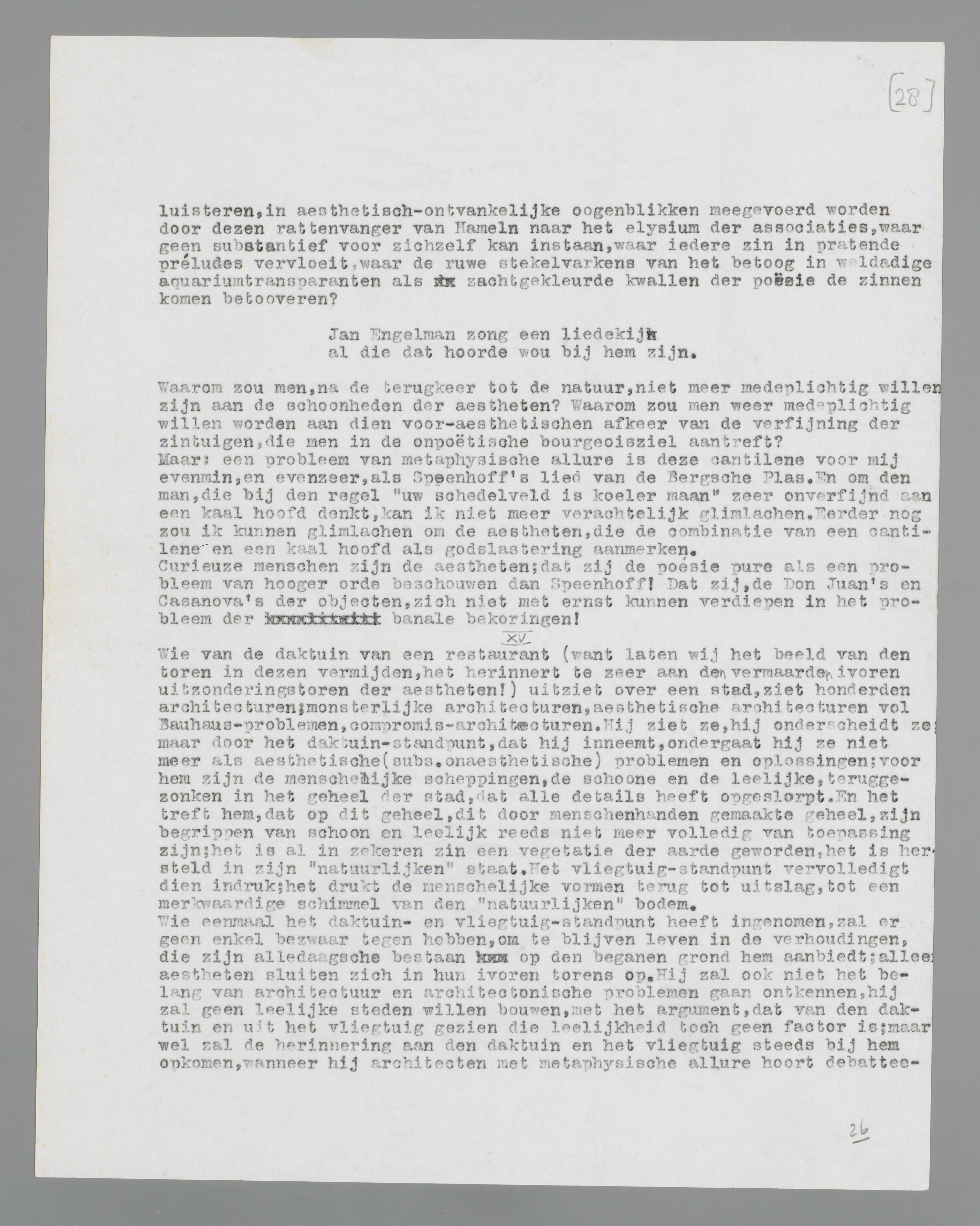Jan Engelman zingt zachtjes voor zich heen, hij complotteert geraffineerd en argeloos met de muziek, in woorden, in halve, bekoorlijk verweekte beteekenissen, die alle vlinderachtige losheid van naïeve klanken simuleeren en toch woorden blijven, schemerende associaties, verleidelijke wenken naar het rijk der begrippen; wel, waarom zou men Jan Engelman niet zachtjes laten zingen, waarom zou men boos op hem worden, waarom zou men niet gestreeld luisteren, in aesthetisch-ontvankelijke oogenblikken meegevoerd worden door dezen rattenvanger van Hameln naar het elysium der associaties, waar geen substantief voor zichzelf kan instaan, waar iedere zin in pratende préludes vervloeit, waar de ruwe stekelvarkens van het betoog in weldadige aquariumtransparanten als zachtgekleurde kwallen der poëzie de zinnen komen betooveren?