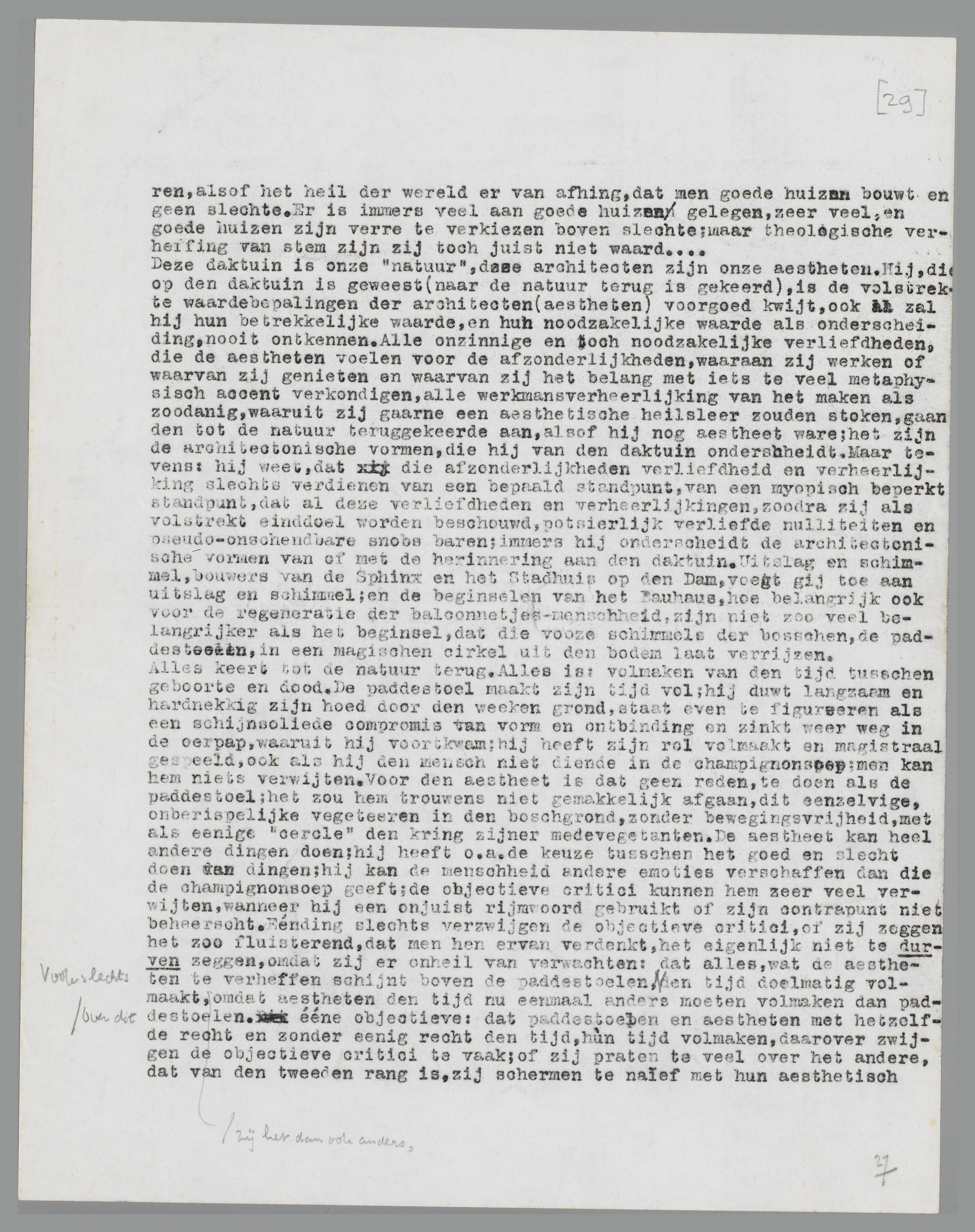 Deze daktuin is onze hervonden ‘natuur’, de al te gewichtige architecten zijn onze aestheten. Hij, die op den daktuin is geweest (naar de natuur terug is gekeerd), is de volstrekte waardebepalingen der architecten (aestheten) voorgoed kwijt, ook al zal hij hun betrekkelijke waarde, en hun noodzakelijke waarde als onderscheiding, nooit ontkennen. Alle onzinnige en toch noodzakelijke verliefdheden, die de aestheten voelen voor de afzonderlijkheden, waaraan zij werken of waarvan zij genieten en waarvan zij het belang met iets te veel metaphysisch accent verkondigen, alle werkmansverheerlijking van het maken als zoodanig, waaruit zij gaarne een aesthetische heilsleer zouden stoken, gaan den tot de natuur teruggekeerde aan, alsof hij nog aestheet ware; het zijn de architectonische vormen, die hij ook van den daktuin blijft onderscheiden. Maar tevens: hij weet, dat die afzonderlijkheden verliefdheid en verheerlijking slechts verdienen van een bepaald standpunt, van een myopisch beperkt standpunt, dat al deze verliefdheden en verheerlijkingen, zoodra zij als volstrekt einddoel worden beschouwd, potsierlijk verliefde nulliteiten en pseudo-onschendbare snobs baren; immers hij onderscheidt de architectonische vormen van of met de herinnering aan den daktuin. Uitslag en schimmel, bouwers van de Sphinx en het Stadhuis op den Dam, voegt gij toe aan uitslag en schimmel; en de beginselen van het Bauhaus, hoe belangrijk ook voor de regeneratie der balconnetjes-menschheid, zijn niet zoo veel belangrijker dan het beginsel, dat die
