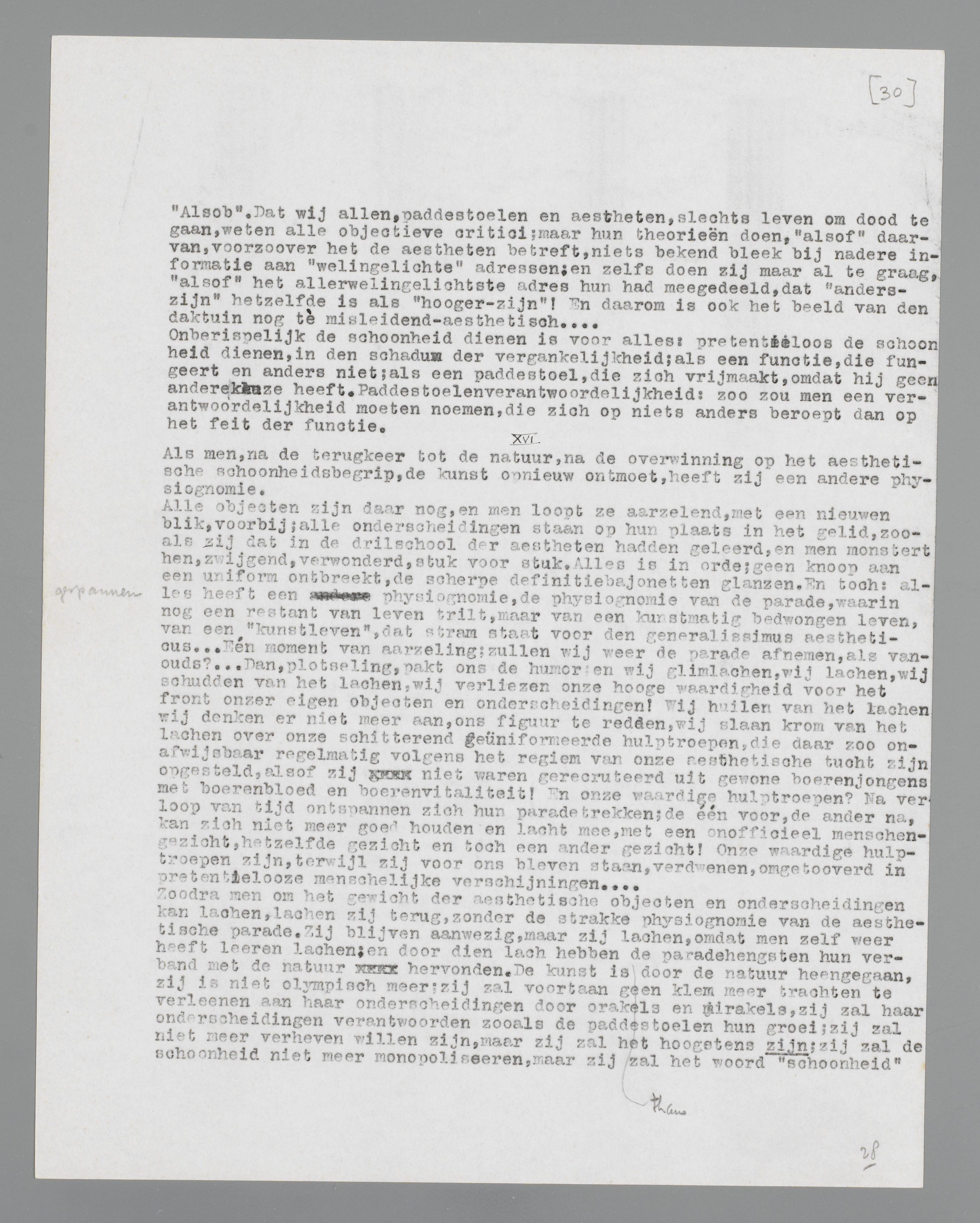 Zoodra men om het gewicht der aesthetische objecten en onderscheidingen kan lachen, lachen zij terug, zonder de strakke physiognomie van de aesthetische parade. Zij blijven aanwezig, maar zij lachen, omdat men zelf weer heeft leeren lachen; en door dien lach hebben de paradehengsten hun verband met de natuur hervonden. De kunst is thans door de natuur heengegaan, zij is niet olympisch meer; zij zal voortaan geen klem meer trachten te verleenen aan haar onderscheidingen door orakels en mirakels, zij zal haar onderscheidingen verantwoorden zooals de paddestoelen hun groei; zij zal niet meer verheven willen zijn, maar zij zal het hoogstens zijn; zij zal de schoonheid niet meer monopoliseeren, maar zij zal het woord ‘schoonheid’ voorloopig door andere woorden vervangen, omdat het in den mond der aestheten een valschen klank heeft gekregen.