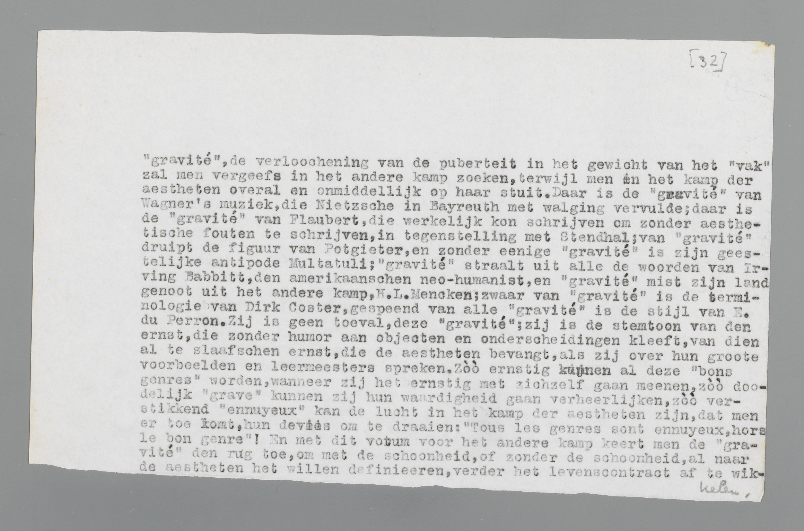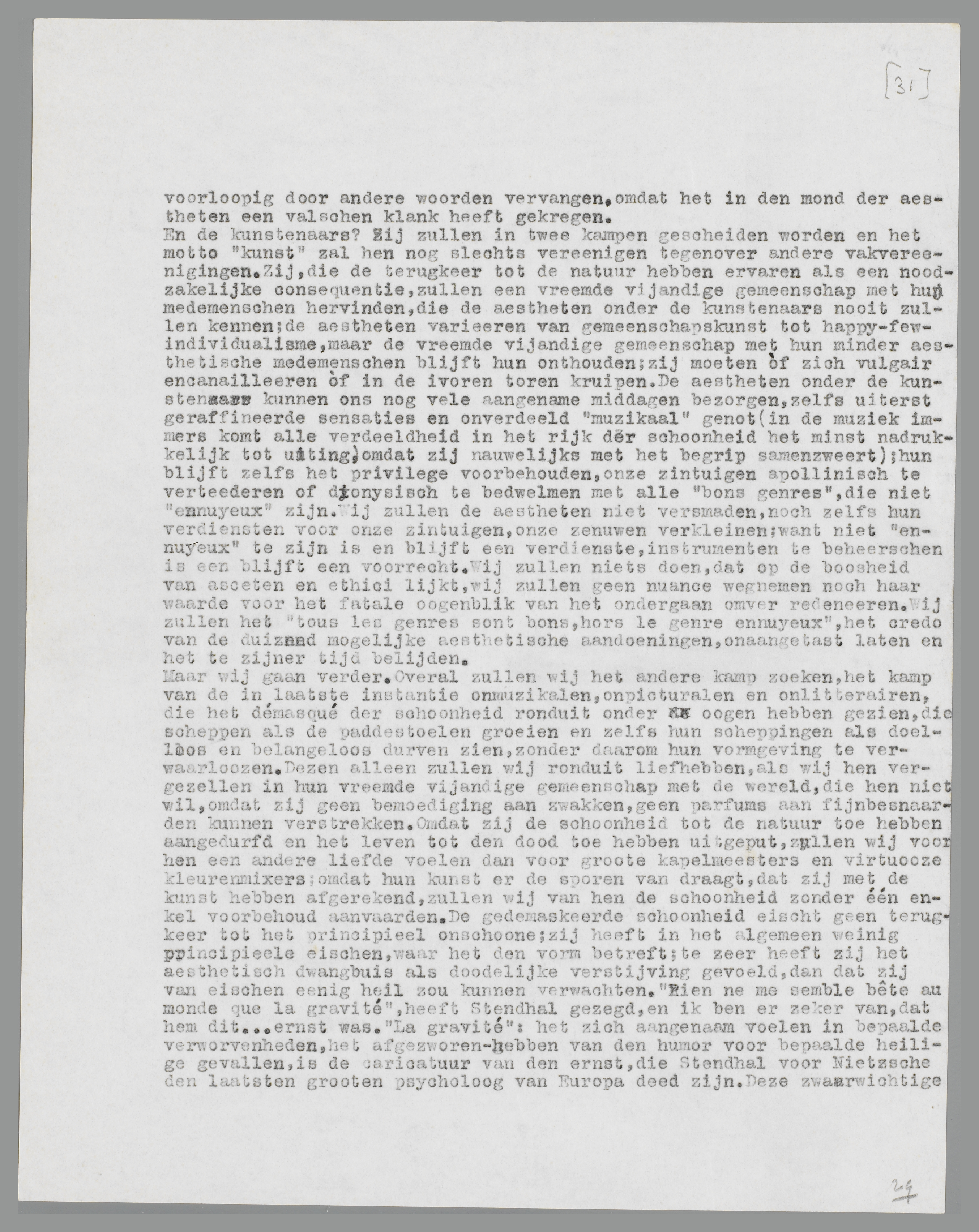dat zij de schoonheid tot de natuur toe hebben aangedurfd en het leven tot den dood toe hebben uitgeput, zullen wij voor hen een andere liefde voelen dan voor groote kapelmeesters en virtuooze kleurenmixers; omdat hun kunst er de sporen van draagt, dat zij met de kunst hebben afgerekend, zullen wij van hen de schoonheid zonder één enkel voorbehoud aanvaarden. De gedemaskeerde schoonheid eischt geen terugkeer tot het principieel onschoone; zij heeft in het algemeen weinig principieele eischen, waar het den vorm betreft; te zeer heeft zij het aesthetisch dwangbuis als doodelijke verstijving gevoeld, dan dat zij van eischen eenig heil zou kunnen verwachten. ‘Rien ne me semble bête au monde que la gravité’, heeft Stendhal gezegd, en ik ben er zeker van, dat hem dit.... ernst was. ‘Gravité’: het zich aangenaam voelen in bepaalde verworvenheden, het afgezworen-hebben van den humor voor bepaalde heilige gevallen, is de caricatuur van den ernst, die Stendhal voor Nietzsche den laatsten grooten psycholoog van Europa deed zijn. Deze zwaarwichtige ‘gravité’, de verloochening van de puberteit in het gewicht van het ‘vak’, zal men vergeefs in het andere kamp zoeken, terwijl men in het kamp der aestheten overal en onmiddellijk op haar stuit. Daar is de ‘gravité’ van Wagner's muziek, die Nietzsche in Bayreuth met walging vervulde; daar is de ‘gravité’ van Châteaubriand, die op bergtoppen moest klauteren om zijn menschelijke nietigheid te beseffen, waarnaast een Stendhal goddank vulgair schijnt; van ‘gravité’ druipt de figuur van Potgieter, en zonder eenige ‘gravité’ is zijn geestelijke antipode Multatuli; ‘gravité’ straalt uit alle de woorden van Irving Babbitt, den Amerikaanschen neo-humanist, en ‘gravité’ mist zijn landgenoot uit het andere kamp, H.L. Mencken; zwanger van ‘gravité’ is de terminologie van Dirk Coster, gespeend van alle ‘gravité’ is de stijl van E. du Perron. Zij is geen toeval, deze ‘gravité’; zij is de stemtoon van den ernst, die