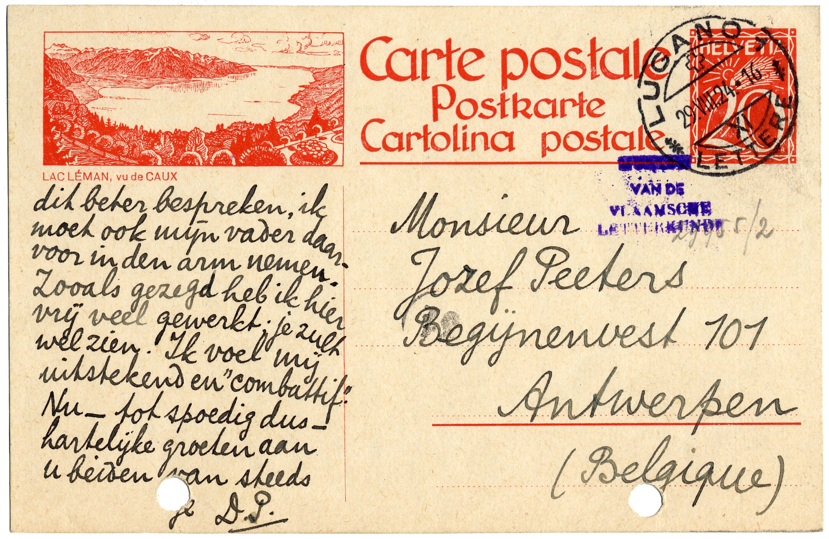 Laat mij niets meer opzenden na 2 Sept. - ik vertrek wschl. al den 5en of 6en van hier; de kuur heeft mij veel goed gedaan en ik dacht voor de nieuwe kou naar Br. terug te gaan om er een en ander in orde te brengen en dan maar weer opnieuw te vertrekken. Ik schrijf je zoodra ik terug ben, houd de proeven dus vooreerst maar bij je. Mocht je een uitgever hebben gevonden, des te beter. Ik ontving van B. een schrijven, waarin hij met geen woord repte over het journaal15; vanmorgen kwam jouw kaart. Alles blijft dus bij het oude (als tenminste het nieuwe niet beginnen gaat!) Maar als we weer samen zijn kunnen we dit beter bespreken, ik moet ook mijn vader daarvoor in den arm nemen. Zooals gezegd heb ik hier vrij veel gewerkt; je zult wel zien.16 Ik voel mij uitstekend en ‘combattif’. Nu - tot spoedig dus - hartelijke groeten aan u beiden van steeds je