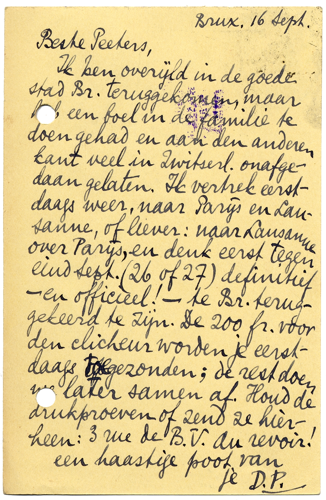 Ik ben overijld in de goede stad Br. teruggekomen, maar heb een boel in de familie te doen gehad en aan den anderen kant veel in Zwitserl. onafgedaan gelaten. Ik vertrek eerstdaags weer, naar Parijs en Lausanne, of liever: naar Lausanne over Parijs, en denk eerst tegen eind Sept. (26 of 27) definitief - en officieel! - te Br. teruggekeerd te zijn. De 200 fr. voor den clicheur worden je eerstdaags toegezonden; de rest doen we later samen af. Houd de drukproeven of zend ze hierheen: 3 rue de B.V.17 Au revoir!