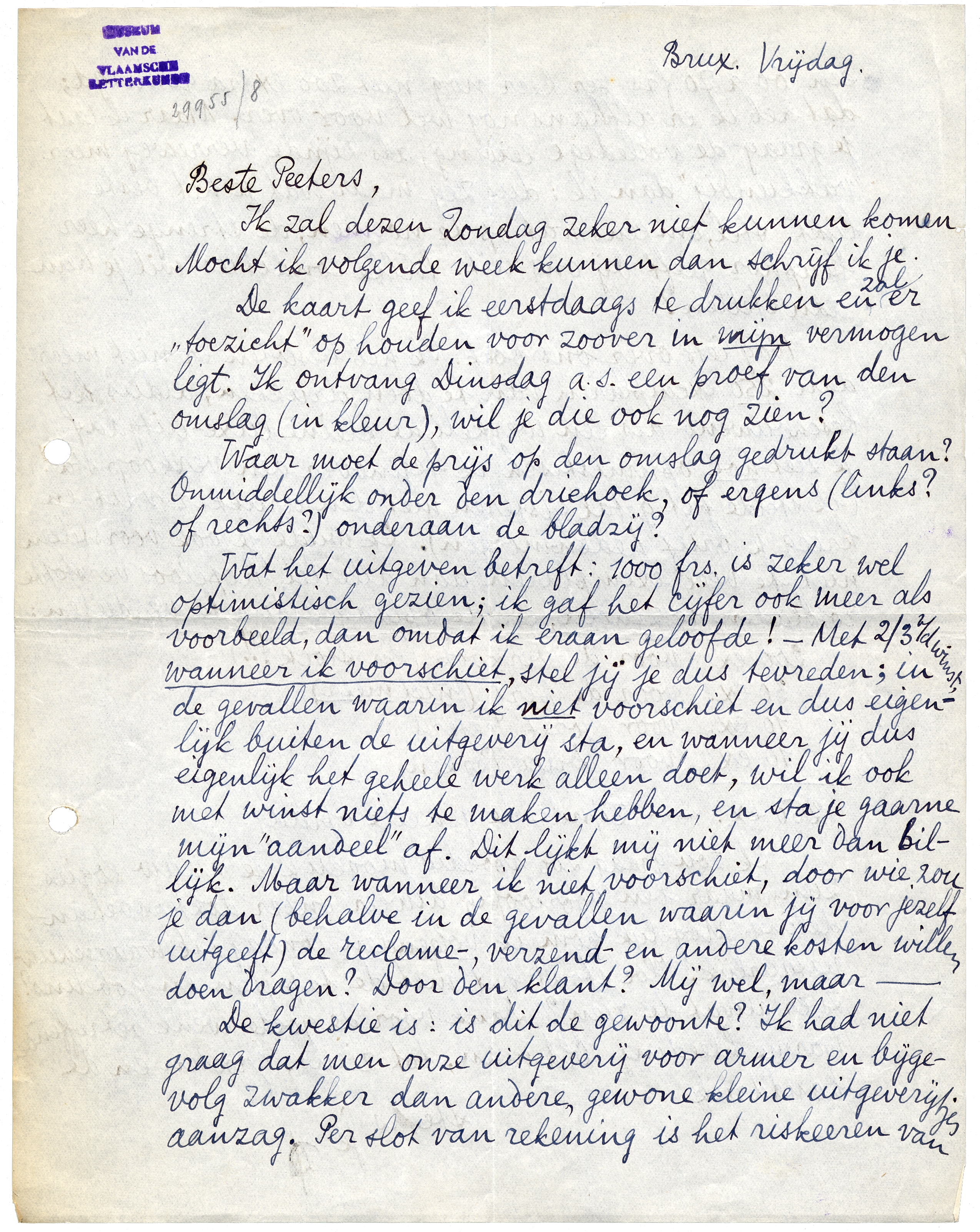De kwestie is: is dit de gewoonte? Ik had niet graag dat men onze uitgeverij voor armer en bijgevolg zwakker dan andere, gewone kleine uitgeverijtjes aanzag. Per slot van rekening is het riskeeren van een 60 à 70 frs. per keer nog niet zoo extra-gewaagd; dat heb ik er althans nog wel voor over. Maar ik laat je graag de volledige leiding, als zijnde verreweg meer ‘vakkundig’ dan ik; dus zeg maar wat je het beste lijkt. Stel, om eens wat op te noemen, de strenge heer Seuphor geeft bij ons uit. Welke condities wil je hem dan stellen?