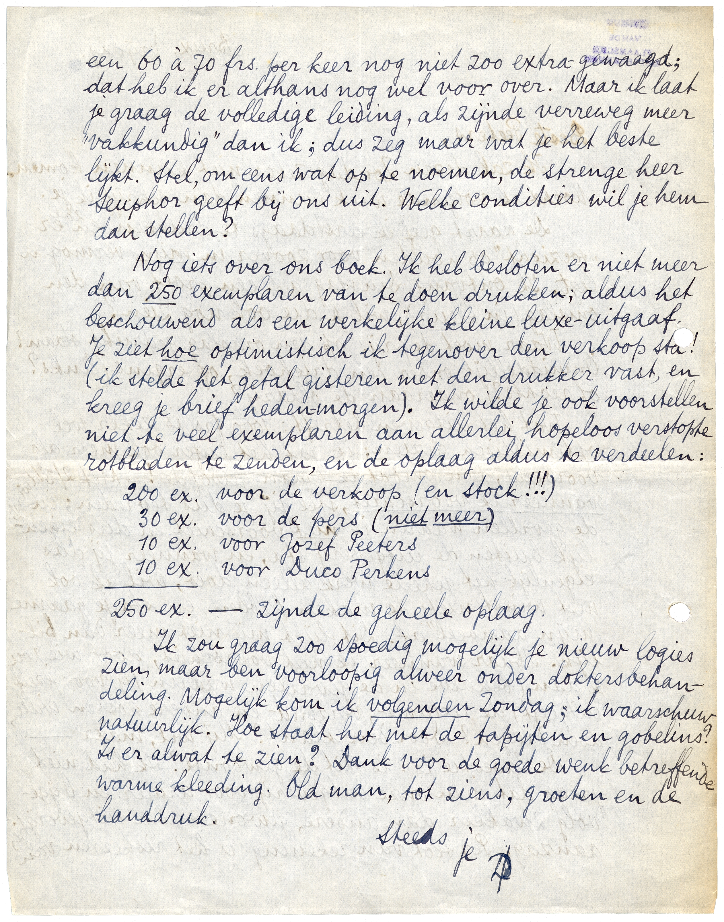 Nog iets over ons boek. Ik heb besloten er niet meer dan 250 exemplaren van te doen drukken; aldus het beschouwend als een werkelijke kleine luxe-uitgaaf. Je ziet hoe optimistisch ik tegenover den verkoop sta! (ik stelde het getal gisteren met den drukker vast, en kreeg je brief heden-morgen). Ik wilde je ook voorstellen niet te veel exemplaren aan allerlei hopeloos verstopte rotbladen te zenden, en de oplaag aldus te verdeelen: