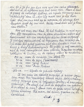 Wat het uitgeven betreft: 1000 frs. is zeker wel optimistisch gezien; ik gaf het cijfer ook meer als voorbeeld, dan omdat ik eraan geloofde! - Met 2/3 v/d winst wanneer ik voorschiet, stel jij je dus tevreden; in de gevallen waarin ik niet voorschiet en dus eigenlijk buiten de uitgeverij sta, en wanneer jij dus eigenlijk het geheele werk alleen doet, wil ik ook met winst niets te maken hebben, en sta je gaarne mijn ‘aandeel’ af. Dit lijkt mij niet meer dan billijk. Maar wanneer ik niet voorschiet, door wie zou je dan (behalve in de gevallen waarin jij voor jezelf uitgeeft) de reclame-, verzend- en andere kosten willen doen dragen? Door den klant? Mij wel maar -