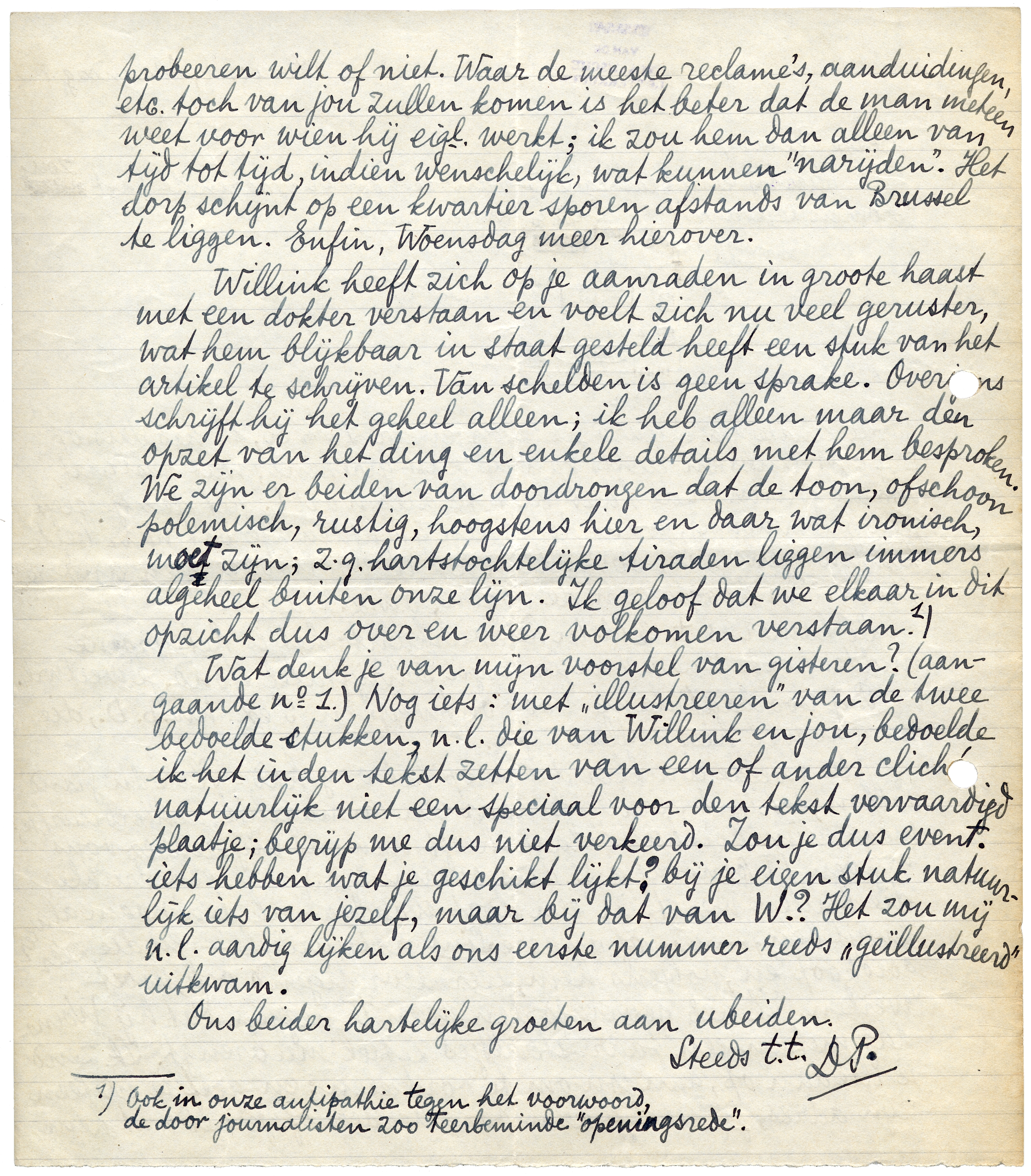Willink heeft zich op je aanraden in groote haast met een dokter verstaan en voelt zich nu veel geruster, wat hem blijkbaar in staat gesteld heeft een stuk van het artikel te schrijven. Van schelden is geen sprake. Overigens schrijft hij het geheel alleen; ik heb alleen maar den opzet van het ding en enkele details met hem besproken. We zijn er beiden van doordrongen dat de toon, ofschoon polemisch, rustig, hoogstens hier en daar wat ironisch, moet zijn; z.g. hartstochtelijke tiraden liggen immers algeheel buiten onze lijn. Ik geloof dat we elkaar in dit opzicht dus over en weer volkomen verstaan.*