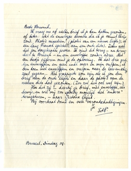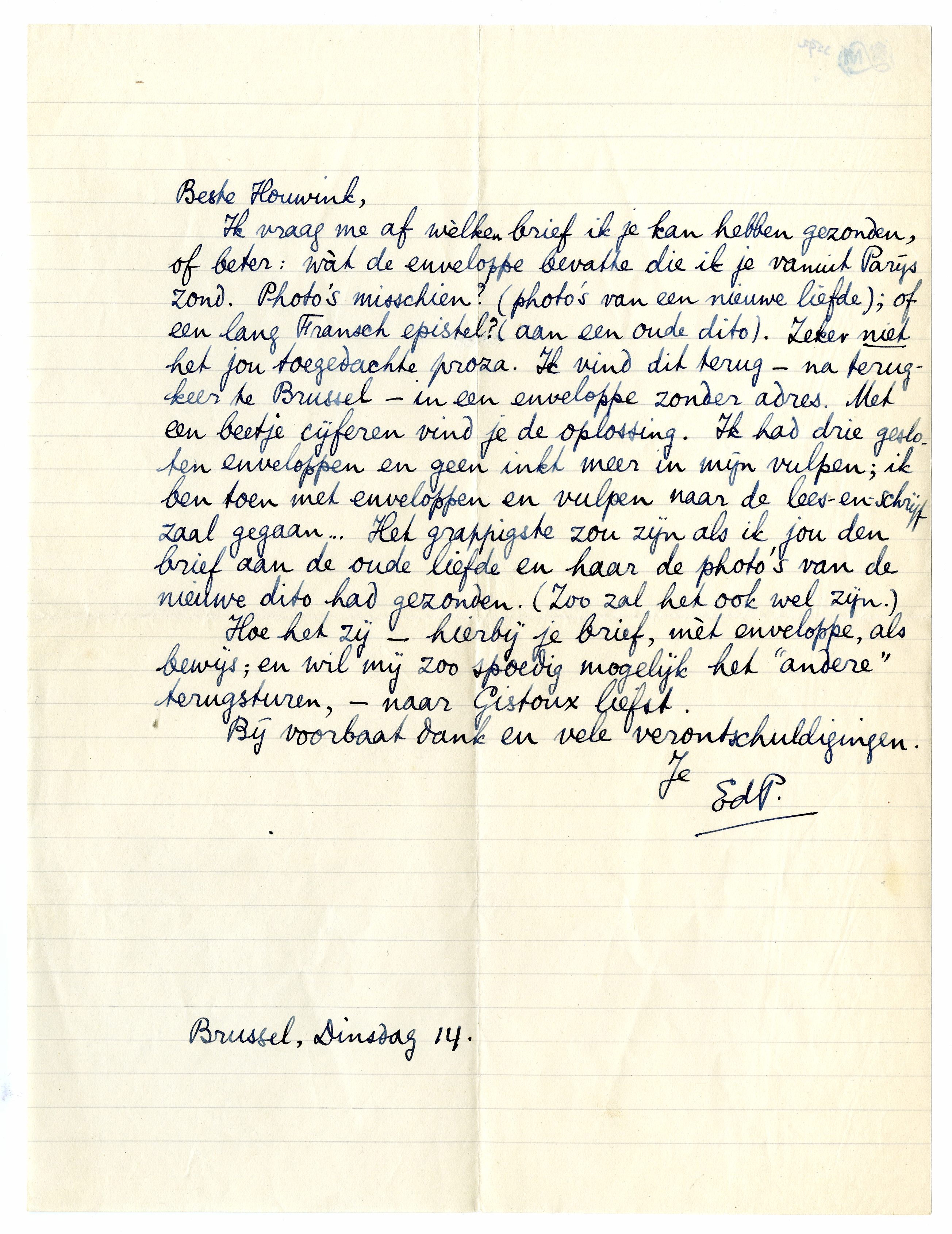 Ik vraag me af wèlken brief ik je kan hebben gezonden, of beter: wàt de enveloppe bevatte die ik je vanuit Parijs zond. Photo's mis-schien? (photo's van een nieuwe liefde); of een lang Fransch epistel? (aan een oude dito). Zeker niet het jou toegedachte proza. Ik vind dit terug - na terugkeer te Brussel - in een enveloppe zonder adres. Met een beetje cijferen vind je de oplossing. Ik had drie gesloten enveloppen en geen inkt meer in mijn vulpen; ik ben toen met enveloppen en vulpen naar de lees-en-schrijfzaal gegaan... Het grappigste zou zijn als ik jou den brief aan de oude liefde en haar de photo's van de nieuwe dito had gezonden. (Zoo zal het ook wel zijn.)