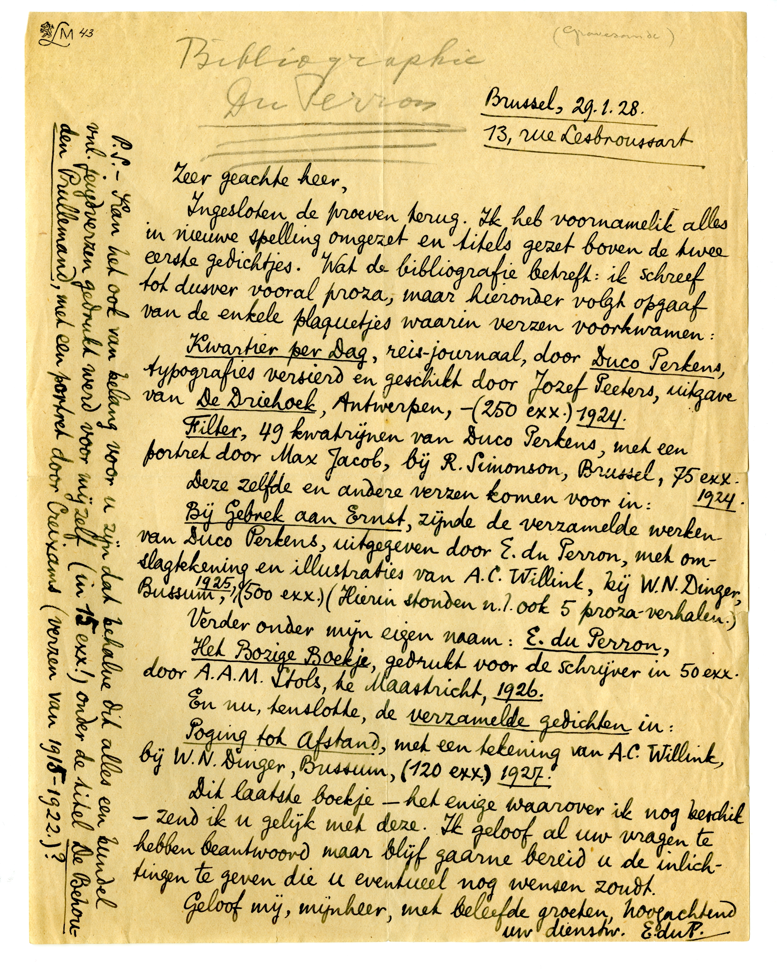 Ingesloten de proeven286 terug. Ik heb voornamelik alles in nieuwe spelling omgezet en titels gezet boven de twee eerste gedichtjes. Wat de bibliografie betreft: ik schreef tot dusver vooral proza, maar hieronder volgt opgaaf van de enkele plaquetjes waarin verzen voorkwamen:
