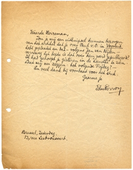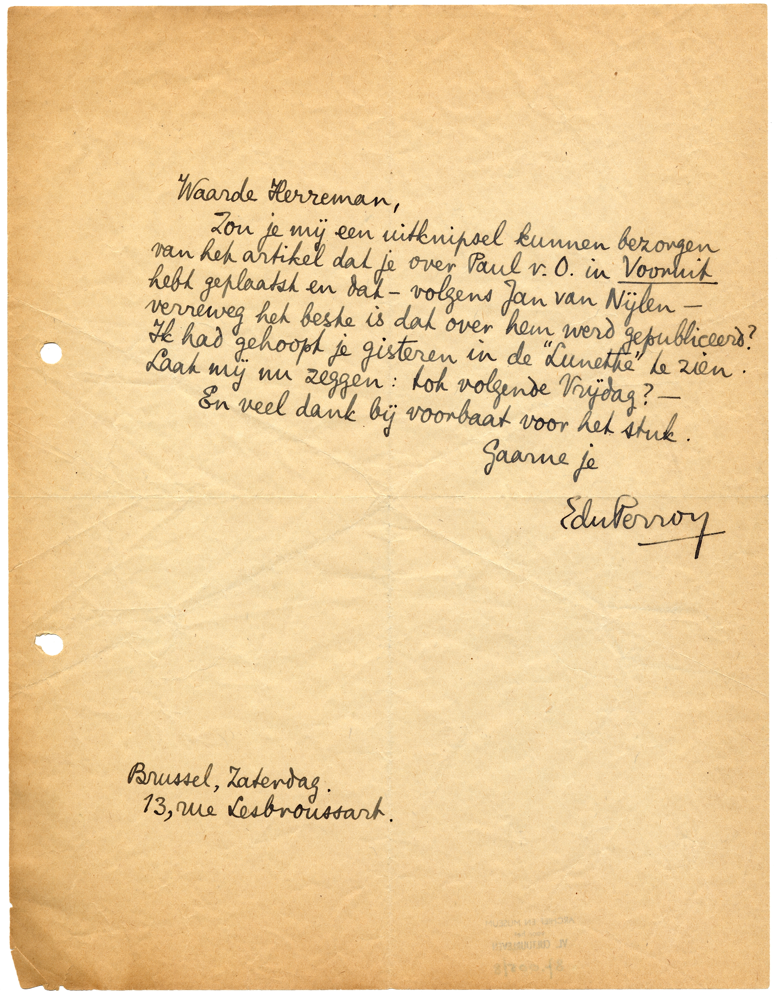 Zou je mij een uitknipsel kunnen bezorgen van het artikel dat je over Paul v.O. in Vooruit hebt geplaatst en dat - volgens Jan van Nijlen - verreweg het beste is dat over hem werd gepubliceerd327? Ik had gehoopt je gisteren in de ‘Lunette’ te zien. Laat mij nu zeggen: tot volgende Vrijdag? -