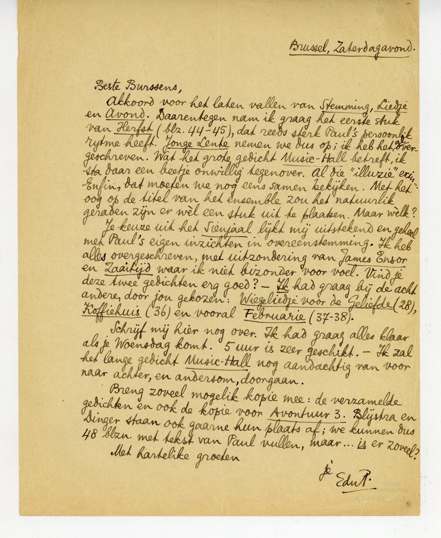 Akkoord voor het laten vallen van Stemming, Liedje en Avond. Daarentegen nam ik graag het eerste stuk van Herfst (blz. 44-45), dat reeds sterk Paul's persoonlik rytme heeft.Jonge Lente nemen we dus op; ik heb het al overgeschreven. Wat het grote gedicht Music-Hall betreft, ik sta daar een beetje onwillig tegenover. Al die ‘illuzie’ erin... Enfin, dat moeten we nog eens samen bekijken. Met het oog op de titel van het ensemble zou het natuurlik geraden zijn er wèl een stuk uit te plaatsen. Maar wèlk?