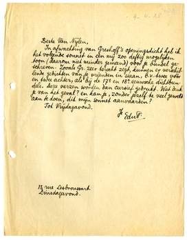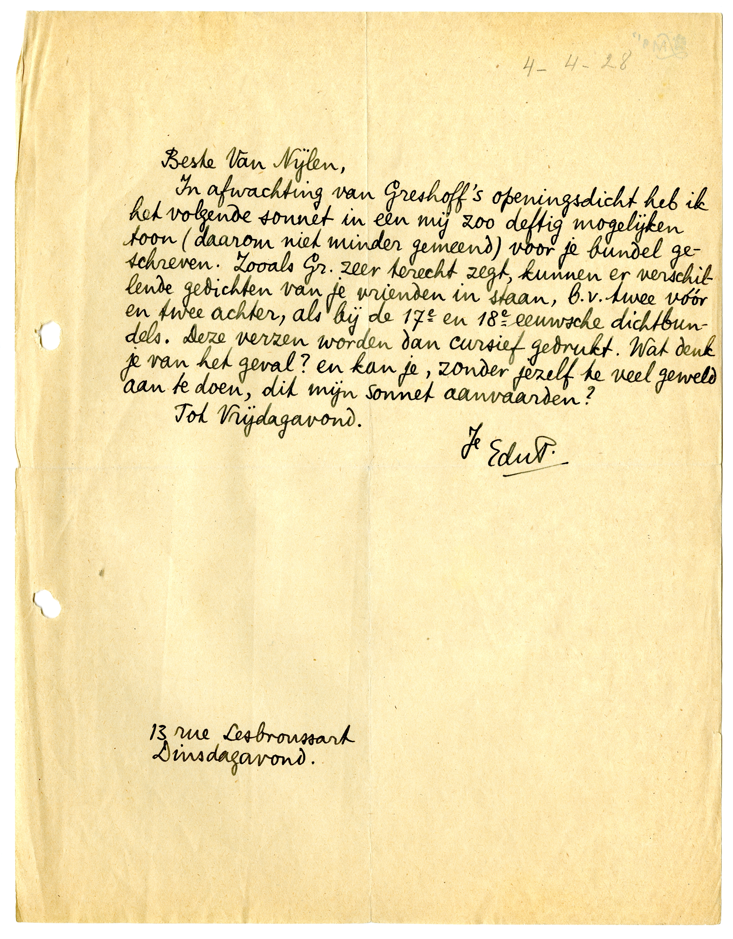 In afwachting van Greshoff's openingsdicht heb ik het volgende sonnet335 in een mij zoo deftig mogelijken toon (daarom niet minder gemeend) voor je bundel geschreven. Zooals Gr. zeer terecht zegt, kunnen er verschillende gedichten van je vrienden in staan, b.v. twee vóór en twee achter, als bij de 17e en 18e eeuwsche dichtbundels. Deze verzen worden dan cursief gedrukt. Wat denk je van het geval? en kan je, zonder jezelf te veel geweld aan te doen, dit mijn sonnet aanvaarden?
