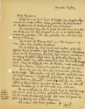 Vgl. de tekst die ik je zend met andere, gedrukte teksten die je misschien nog zult tegenkomen (Barbaarse Dans en In Memoriam H.v.d.R. zijn immers verschenen337) en wijzig de tekst altijd naar de gedrukte lezing die immers wsch. van later datum is en door Paul zelf bezorgd werd. Maar de volgorde van De Feesten moet natuurlik behouden blijven. Jespers dringt hier terecht op aan.