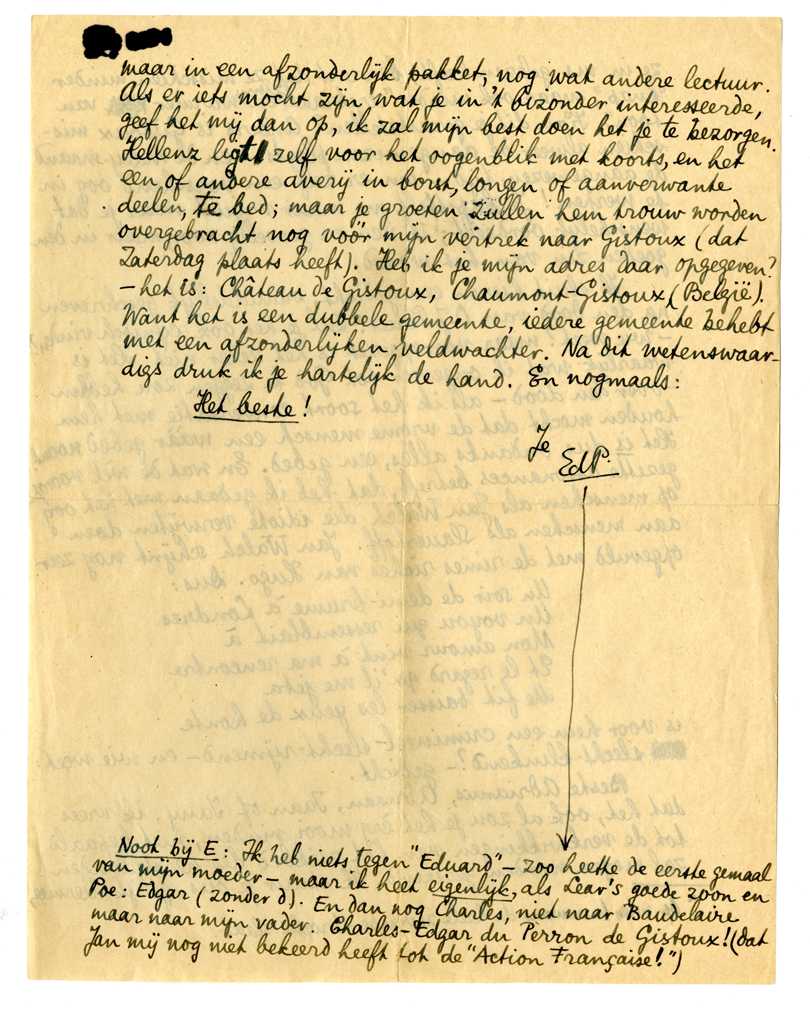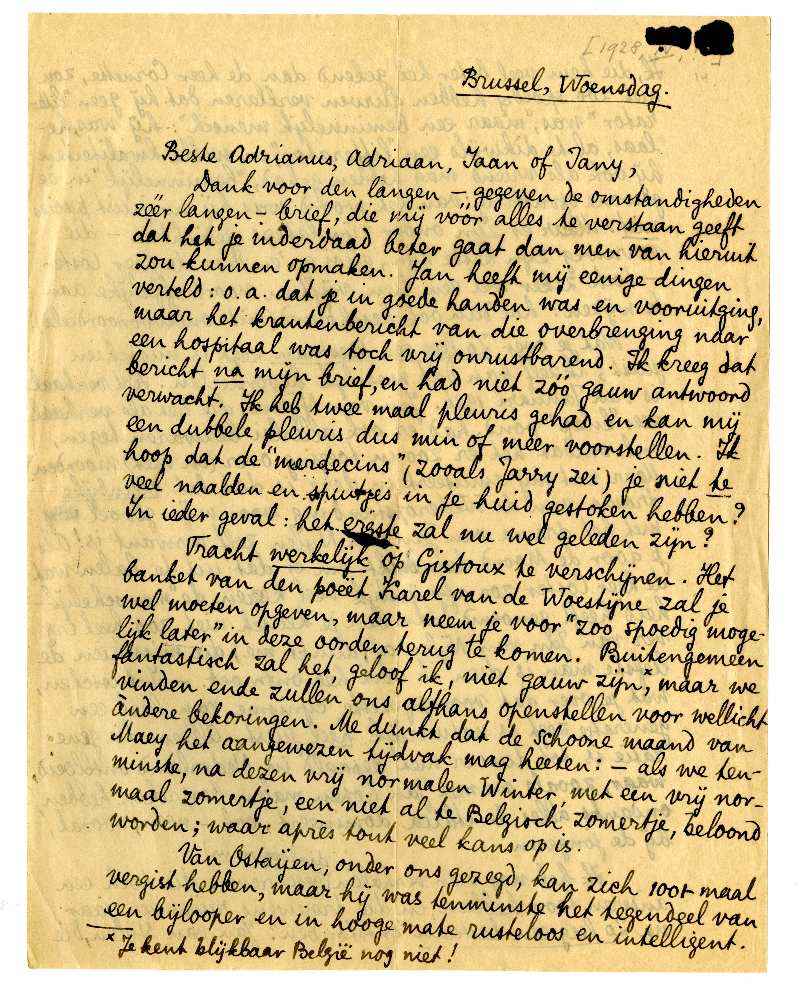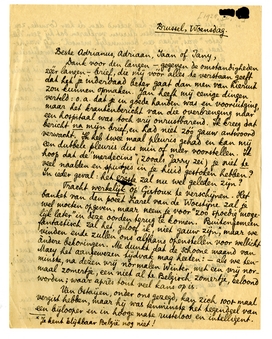 Beste Adrianus, Adriaan, Jaan of Jany, ik vrees dat het, ook al zou je het èrg mooi vinden, niet bepaald tot de verkwikkingen van het ziekbed des herstellenden zal mogen worden gerekend. Ik stuur je dus, gelijk hiermee, maar in een afzonderlijk pakket, nog wat andere lectuur. Als er iets mocht zijn wat je in 't bizonder interesseerde, geef het mij dan op, ik zal mijn best doen het je te bezorgen. Hellenz ligt zelf voor het oogenblik met koorts, en het een of andere averij in borst, longen of aanverwante deelen, te bed; maar je groeten zullen hem trouw worden overgebracht nog vóór mijn vertrek naar Gistoux (dat Zaterdag plaats heeft). Heb ik je mijn adres daar opgegeven? - het is: Château de Gistoux, Chaumont-Gistoux, (België). Want het is een dubbele gemeente, iedere gemeente behebt met een afzonderlijken veldwachter. Na dit wetenswaardigs druk ik je hartelijk de hand. En nogmaals: