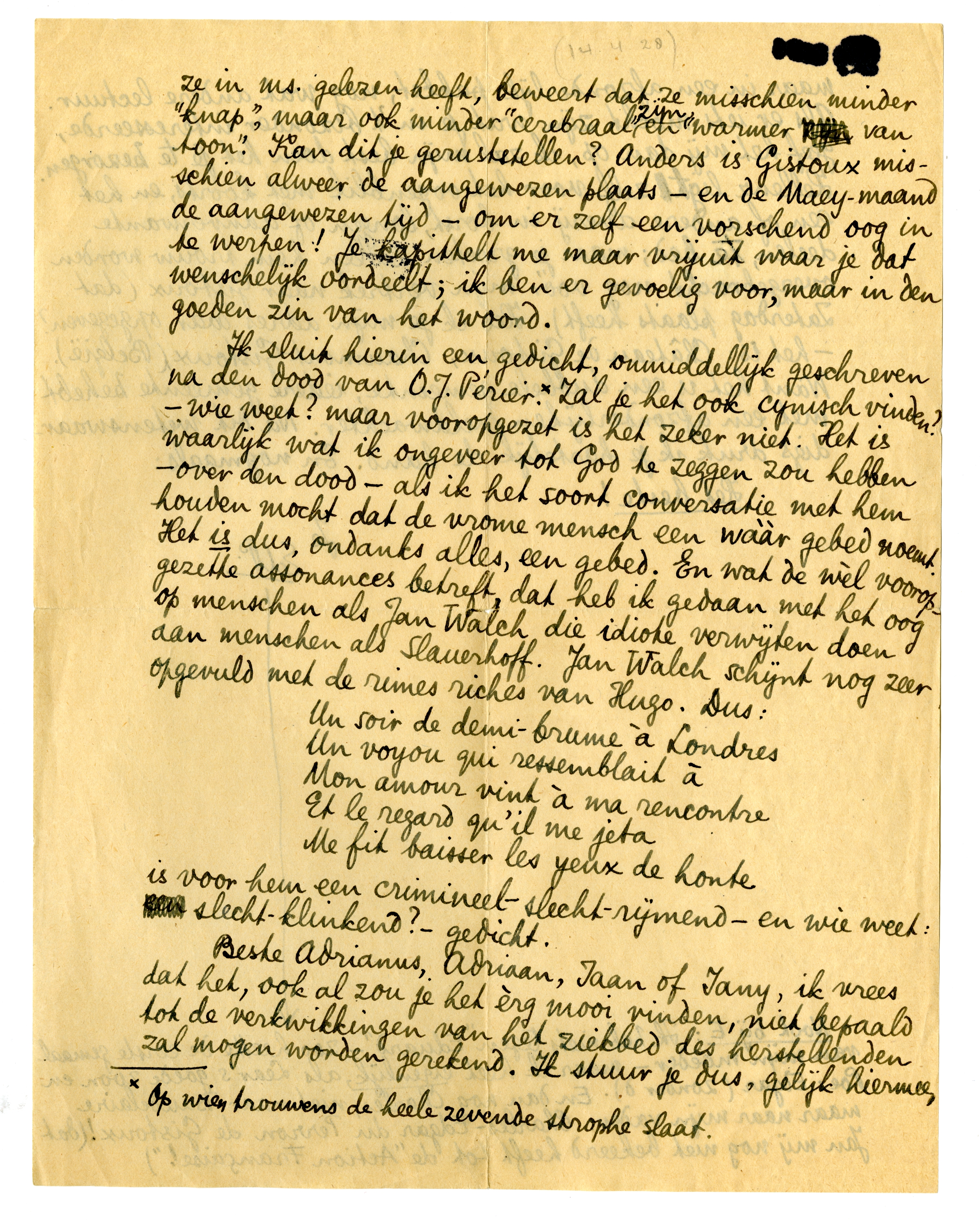 Ik sluit hierin een gedicht, onmiddellijk geschreven na den dood van O.J. Périer.341* Zal je het ook cynisch vinden: - wie weet? maar vooropgezet is het zeker niet. Het is waarlijk wat ik ongeveer tot God te zeggen zou hebben - over den dood - als ik het soort conversatie met hem houden mocht dat de vrome mensch een wààr gebed noemt. Het is dus, ondanks alles, een gebed. En wat de wèl voor-opgezette assonances betreft, dat heb ik gedaan met het oog op menschen als Jan Walch die idiote verwijten doen aan menschen als Slauerhoff. Jan Walch schijnt nog zeer opgevuld met de rimes riches van Hugo. Dus: