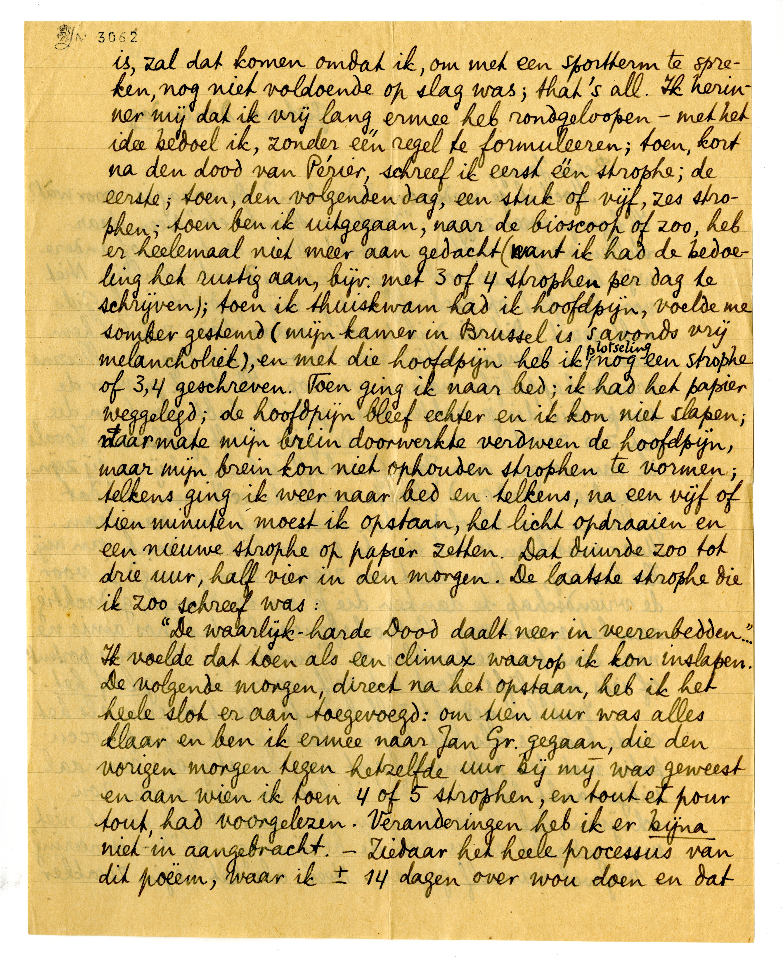 Wat het gedicht zelf betreft: tant mieux als het einde beter is als het begin. Maar je vat mijn preoccupatie met den polemiek-kant wat ernstig op; eenmaal uitgemaakt hebbende dat ik het in assonancen zou schrijven, heb ik verder aan dien heer Walch heusch niet meer gedacht en is ook de berijming - of ‘be-assoneering’ - vrijwel vanzelf gegaan. Neen, als het begin zwakker is, zal dat komen omdat ik, om met een sportterm te spreken, nog niet voldoende op slag was; that's all. Ik herinner mij dat ik vrij lang ermee heb rondgeloopen - met het idee bedoel ik, zonder één regel te formuleeren; toen, kort na den dood van Périer, schreef ik eerst één strophe; de eerste; toen, den volgenden dag, een stuk of vijf, zes strophen; toen ben ik uitgegaan, naar de bioscoop of zoo, heb er heelemaal niet meer aan gedacht (want ik had de bedoeling het rustig aan, bijv. met 3 of 4 strophen per dag te schrijven); toen ik thuiskwam had ik hoofdpijn, voelde me somber gestemd (mijn kamer in Brussel is 's avonds vrij melancholiek), en met die hoofdpijn heb ik plotseling nog een strophe of 3, 4 geschreven. Toen ging ik naar bed; ik had het papier weggelegd; de hoofdpijn bleef echter en ik kon niet slapen; naarmate mijn brein doorwerkte verdween de hoofdpijn, maar mijn brein kon niet ophouden strophen te vormen; telkens ging ik weer naar bed en telkens, na een vijf of tien minuten moest ik opstaan, het licht opdraaien en een nieuwe strophe op papier zetten. Dat duurde zoo tot drie uur, half vier in den morgen. De laatste strophe die ik zoo schreef was: